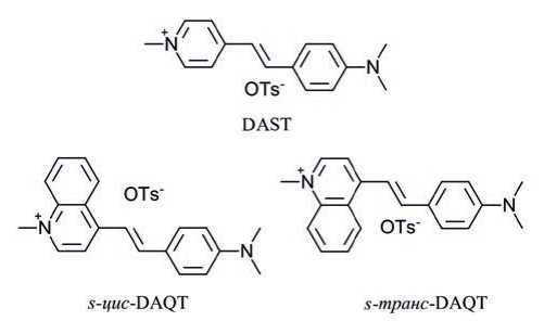 Одним из наиболее исследованных красителей с нелинейно-оптическими свойствами является DAST (рис. 1). Структура хромофора этого красителя типа DpA является симметричной и планарной, а сам краситель кристаллизуется в нецентросимметричной упаковке благодаря взаимно перпендикулярной организации планарного хромофора и планарного органического противоиона внутри кристаллической ячейки [20]. При этом нелинейно-оптические свойства красителя проявляются не только в монокристалле, но и в поликристаллическом порошке. Краситель DAQT в целом похож по строению на DAST, однако, отличается наличием аннелированного бензольного цикла в акцепторной части хромофора красителя. В растворе краситель может существовать в виде равновесия двух конформационных форм: s-цис и s-транс (рис. 1) как результат вращения хинолинового фрагмента вокруг одинарной связи. В кристаллической форме наблюдали преимущественно s-транс-изомер [15].