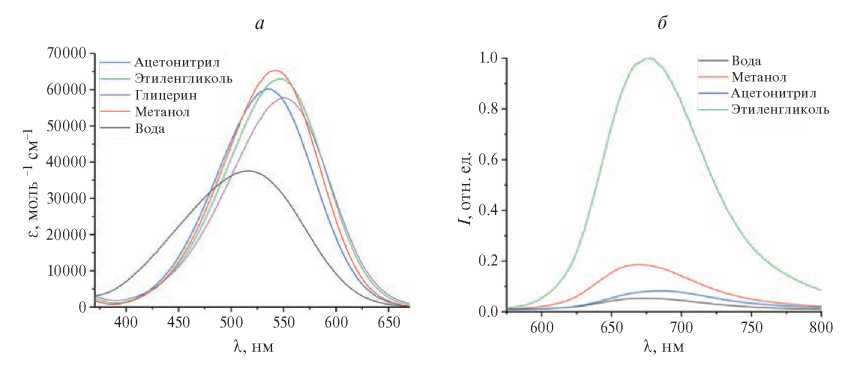 Рис. 3. Спектры поглощения (а) и флуоресценции (б) красителя DAQT в растворителях различной природы (CDAQT = 2∙10–5 M).
