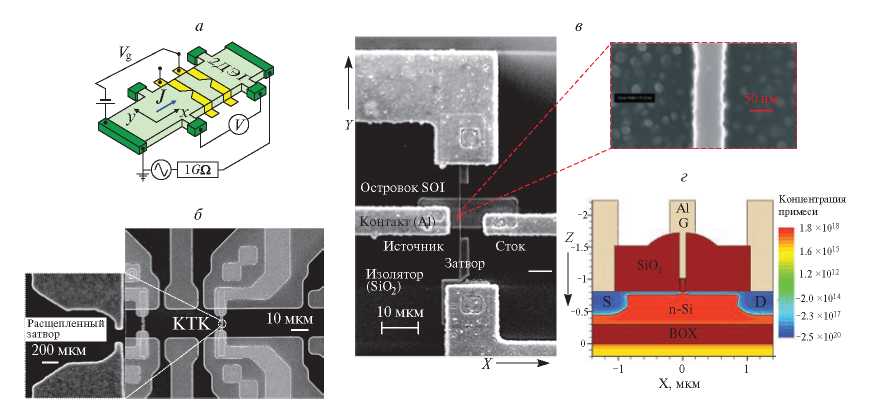 Образцы и четырех-терминальные измерения кондактанса КТК в холловском мостике показаны микрографиями и схематически на рис. 1. Длина канала в КТК в данном случае [41, 42] гораздо меньше, чем была в типичных КТК [1–11], которые сделали возможным изучение квантования кондактанса, но не позволяли измерять кондактанс в глубоком туннельном режиме из-за быстрого увеличения толщины туннельного барьера на уровне Ферми с ростом обедняющего Vg. Напротив, при одинаково малых ширине и длине канала квантование кондактанса не наблюдаемо, согласно теоретическому предсказанию [3], но образцы подходят для изучения туннелирования вплоть до G~10–5G0 [41, 42]. В этом случае канал формировался по стандартной технологии расщепленного затвора, размещенного между потенциометрическими контактами холловского мостика с помощью взрывной электронной литографии по Au/Al (рис. 1а, 1б). Управляемые затворным напряжением Vg сужения в ДЭГ были исследованы в гетероструктурах трех типов, чтобы проверить чувствительность свойств КТК к использованию глубоких, либо мелких примесных центров и разного расположения плоскостей Si-δ-легирования относительно плоскости ДЭГ. Эти три типа гетероструктур представляли собой: 1) обычный гетеропереход AlGaAs/GaAs с Si-δ-легированным AlGaAs; 2) гетеропереход с заменой AlGaAs на короткопериодную сверхрешетку (СР) GaAs/AlAs с Si-δ-легированным ультратонким слоем GaAs в СР; 3) двойной гетеропереход – квантовую яму GaAs в окружении двух таких СР, как в типе 2. Концентрация электронов 𝑁s в ДЭГ, их подвижность µ и длина свободного пробега 𝑙 были для структуры первого типа: 𝑁s = = (3–4)∙1011 см–2, µ = (2–3)∙105 см2/Вс, 𝑙 = (2–3) мкм; для структуры второго типа: 𝑁s = (2–3)∙1011 см–2, µ = (1–2)∙106 см2/Вс, 𝑙 = (5–10) мкм и структуры третьего типа: 𝑁s = (7–8)∙1011 см–2, µ = (1–2)∙106 см2/Вс, 𝑙 = (20–30) мкм. Конструкции гетероструктур подробно описаны в [42]. Во всех случаях типичное расстояние между ДЭГ и металлическим затвором составляло ≈ 100 нм, и трудно получить характерную длину сужения в ДЭГ в таких структурах меньше 100 нм из-за размывания неоднородностей электрического поля затвора в глубине полупроводника. Дополнительно к серии образцов с номинально одинаковыми конструкциями расщепленного затвора для получения КТК в этих гетероструктурах, мы исследовали свойства короткоканального ПТ с носителями p-типа в структуре кремний на изоляторе [43]. Этот образец показан микрографией и схематически вертикальным разрезом на рис. 1 в,г. с указанием характерных размеров, типа и концентрации распределенного примесного легирования. Образец изготовлен по стандартной технологии для ПТ, функционирующих при комнатной температуре [14]. Рабочим телом ПТ служил остров кремния толщиной ≈500 нм на захороненном изоляторе SiO2. Исходно остров был объемно легирован n-типом (фосфором) и имел сильно легированные бором области p-типа, служившие истоком и стоком и имевшие тонкие по z расширения p-типа под рабочей границей Si/SiO2 вплоть до подзатворной области короткого (L ≈ 70 нм) канала n-типа. Над этой областью выше тонкого (4.5 нм) слоя термического SiO2 находился поликремниевый сильно легированный примесями p-типа затвор (G). Затвор, исток и сток контактировали с подводящими Al-электродами. В данном случае дистанция между затвором и каналом гораздо меньше, чем в структурах с ДЭГ и КТК, поэтому длина канала определяется в ПТ длиной затв