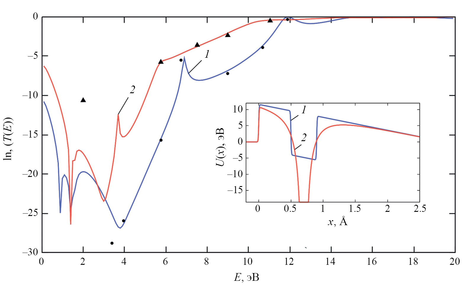 В данной работе исходя из метода поиска собственных значений и собственных функций (метод обратных итераций со сдвигом или модифицированый метод Виландта [19, 20]) стационарных состояний для уравнения Шредингера реализован алгоритм вычисления функции пропускания в материалах Шредингера нанометрового диапазона. Результаты частично обобщены или предлагается обобщить на случай двумерных потенциальных ям: скрученная нанолента [21], поверхность Дини [22] или холестерик [23], периодическая структура, зависящая от продольной и поперечной координат в цилиндрической системе координат. Следует подчеркнуть, что в случае скрученной наноленты задачу собственных значений и собственных функций невозможно свести к методу разделения переменных. В качестве иллюстрации отметим, что реализованный алгоритм использовался для расчета функции прохождения в логарифмическом масштабе: на рис. 1 кривые 1 и 2 соответствуют потенциалам 1 и 2, изображенным на врезке. Маркеры «круг» и «треугольник» соответствуют аналитическим кривым, которые приведены в работе [24, рис. 36]. Тестирование выполнялось также с другими профилями потенциальных энергий, в частности, проведен расчет коэффициента прохождения через прямоугольный потенциальный барьер по аналогии с работой [15]. Сам метод поиска собственных значений и собственных функций стационарных состояний, на основе которого реализован алгоритм вычисления функции пропускания, был в свое время протестирован на осесимметричных волноводах [25, 26], на квантовых точках планарной, цилиндрической и сферической геометрий [27].