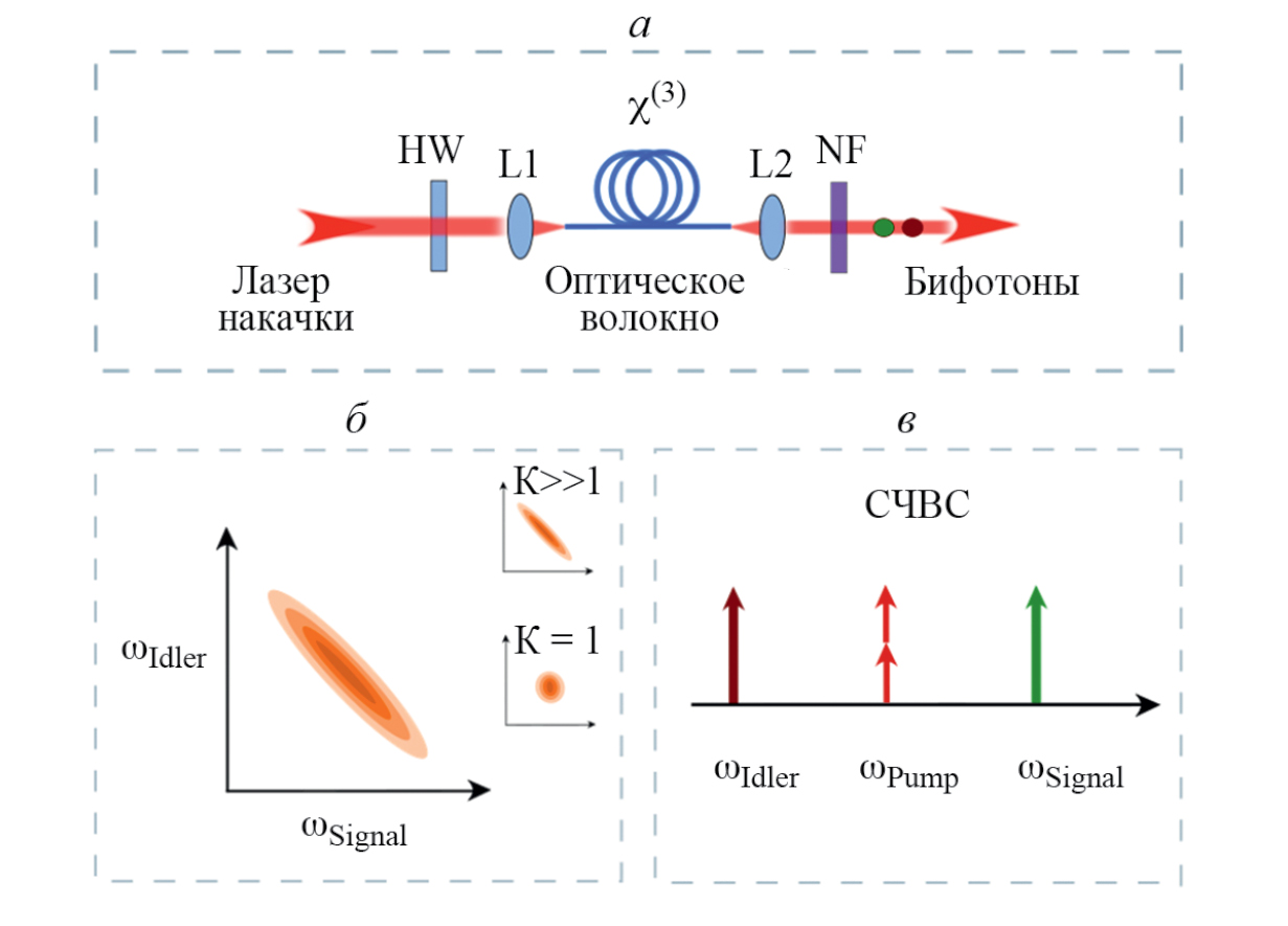Рис. 1. Принципиальная схема генерации бифотонов в оптическом волокне с нелинейной восприимчивостью χ(3)(a). Схематическое изображение функции совместной спектральной интенсивности генерируемых фотонов, K — параметр Шмидта (б). Энергетическая диаграмма процесса спонтанного четырехволнового смешения, при котором уже два фотона накачки преобразуются в два дочерних фотона на других частотах (в).