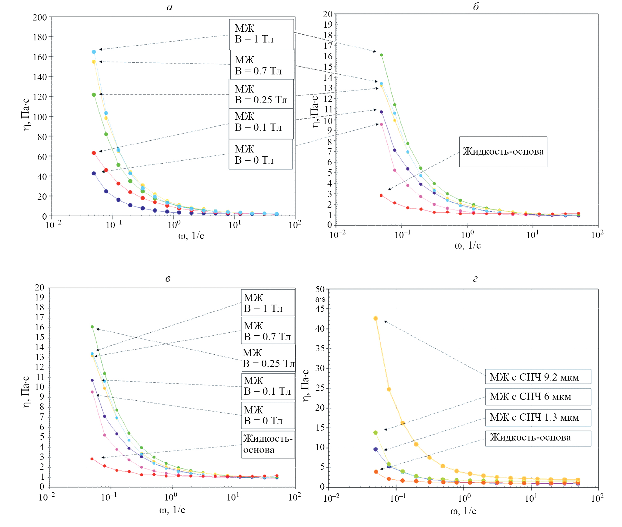 Рис. 2. Зависимость динамической вязкости η от угловой частоты ω для образцов с СНЧ различной длины: 9 (а), 6 (б) и 1.3 мкм (в). Величина напряженности магнитного поля B менялась от 0 до 1 Тл. Сравнение начальных значений вязкости для образцов с разной степенью анизотропии при В = 0 Тл (г). Массовая концентрация СНЧ равна 0.25 %.