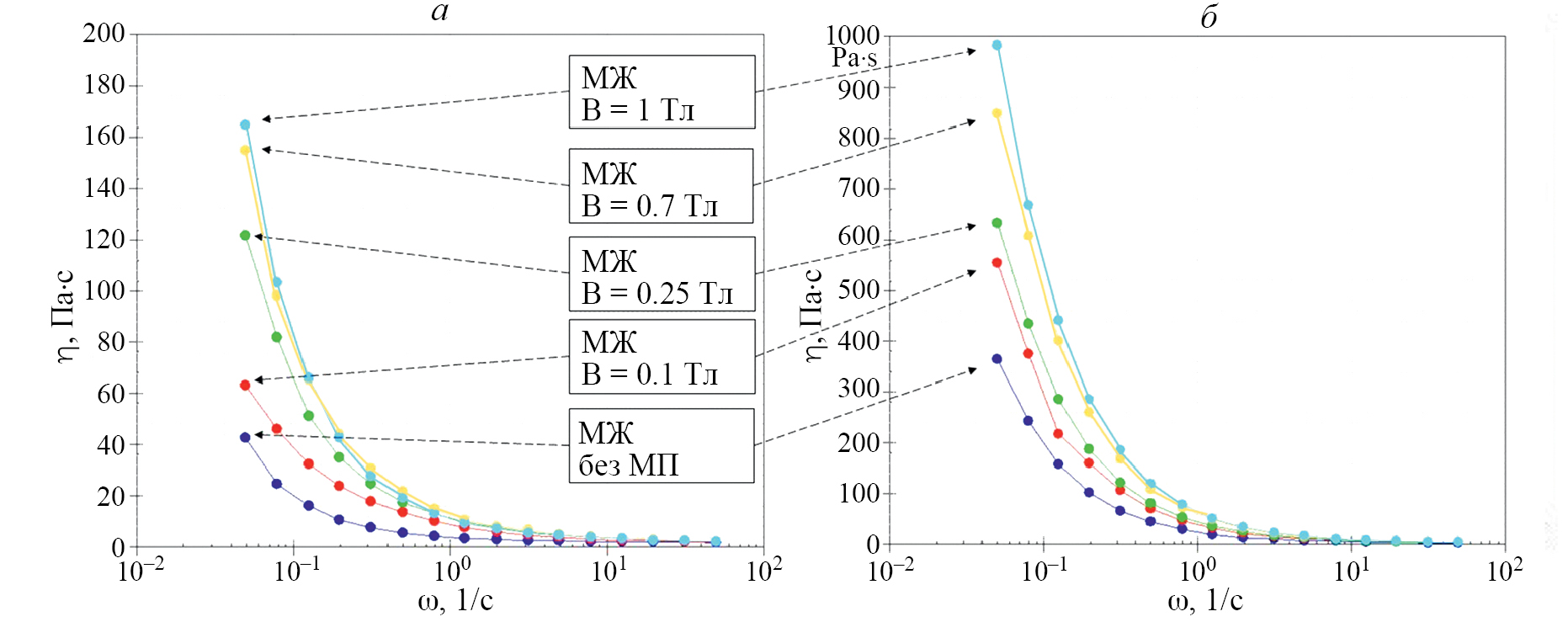 Рис. 3. Зависимость динамической вязкости η от угловой частоты ω для образца с СНЧ длиной 9 мкм при двух значений массовой концентрации: 0.25 (а) и 0.5 масс.% (б). Величина напряженности магнитного поля B менялась от 0 до 1 Тл.