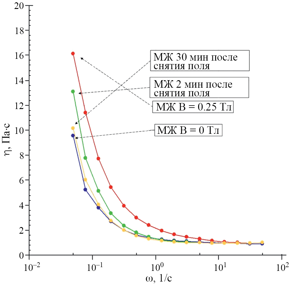 Реологические измерения проводились на ротационном реометре Anton Paar MCR-301 в режиме колебаний с фиксированной амплитудой 3 % и переменной угловой частотой ω = 0.05—50 с-1 при температуре 22°C (измерительная система «плоскость-плоскость»). Для измерений использовалась специальная магнито-реологическая ячейка из немагнитного материала, магнитное поле генерировалось в направлении перпендикулярно сдвигу. Диаметр верхней измерительной пластины 20 мм, зазор 0.5 мм. Пределы допускаемой относительной погрешности измерений динамической вязкости ± 5 %.