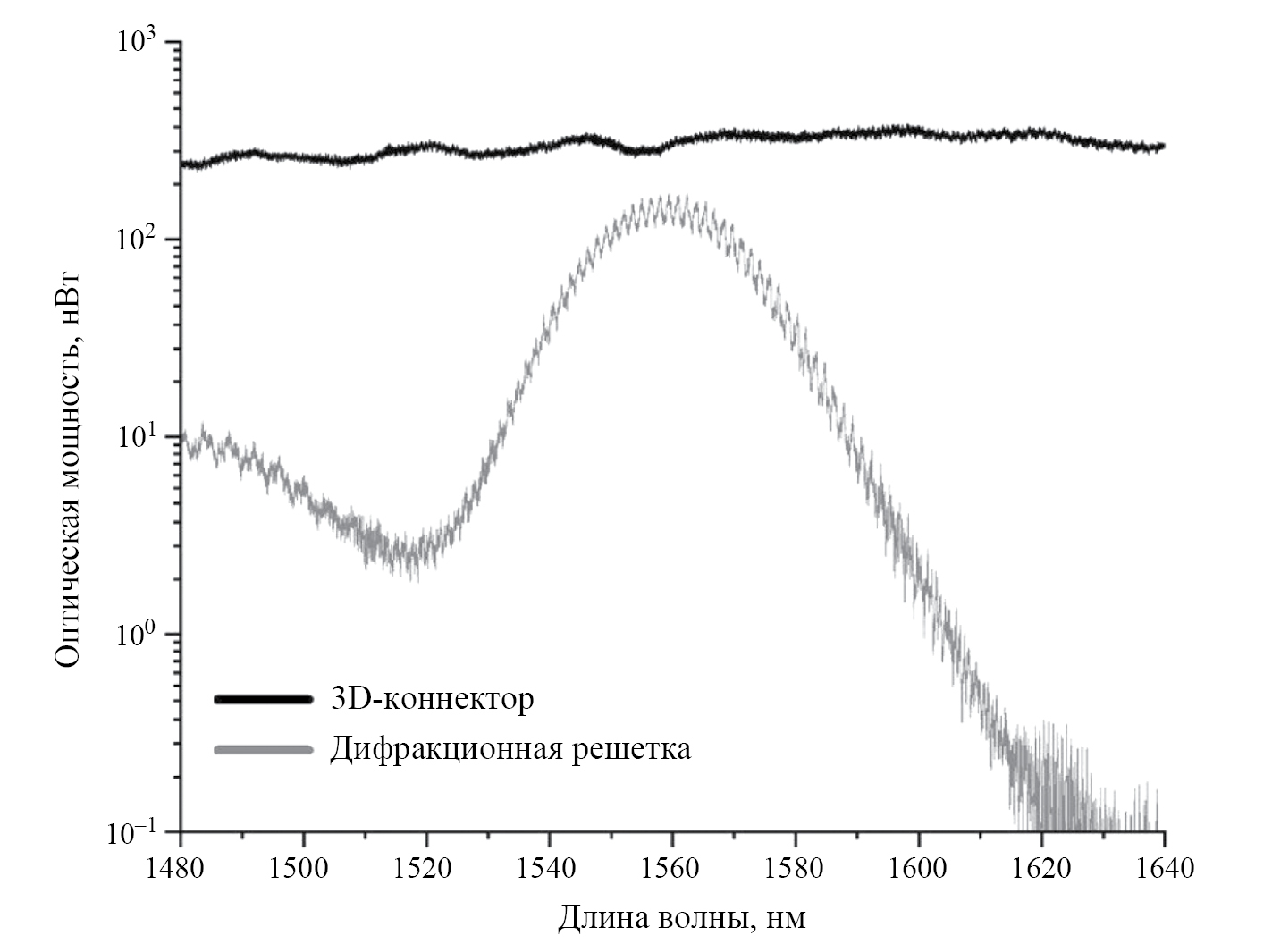 Эффективность 3D-микроструктур для ввода/вывода оптического излучения в ФИС была исследована с помощью оптического измерительного стенда. Было установлено, что наилучшим пропусканием обладали структуры с высотой 50 мкм, которые были меньше подвергнуты эффекту усадки, описанному выше. Также в ходе исследований пропускания 3D-коннекторов было проведено сравнение эффективности 3D-микроструктур и дифракционных решеток в диапазоне длин волн от 1480 до 1640 нм (рис. 5). Для изготовленных 3D-микроструктур для ввода/вывода оптического излучения в ФИС максимальная эффективность была сопоставима с эффективностью дифракционных коннектеров. Разница пропускания в 1.5 раза определена для прохождения излучения через две структуры и существенно зависит от положения массива оптоволокон относительно подложки. Представленные спектры были получены при положении массива оптоволокон на расстоянии порядка 100 мкм от поверхности тестового чипа ФИС. В результате проведенных исследований было показано, что эффективность ввода/вывода 3D-коннекторов слабо зависит от длины волны падающего излучения по сравнению с дифракционными конекторами. Развитый подход в перспективе позволит создавать эффективные элементы ФИС для ввода/вывода излучения.