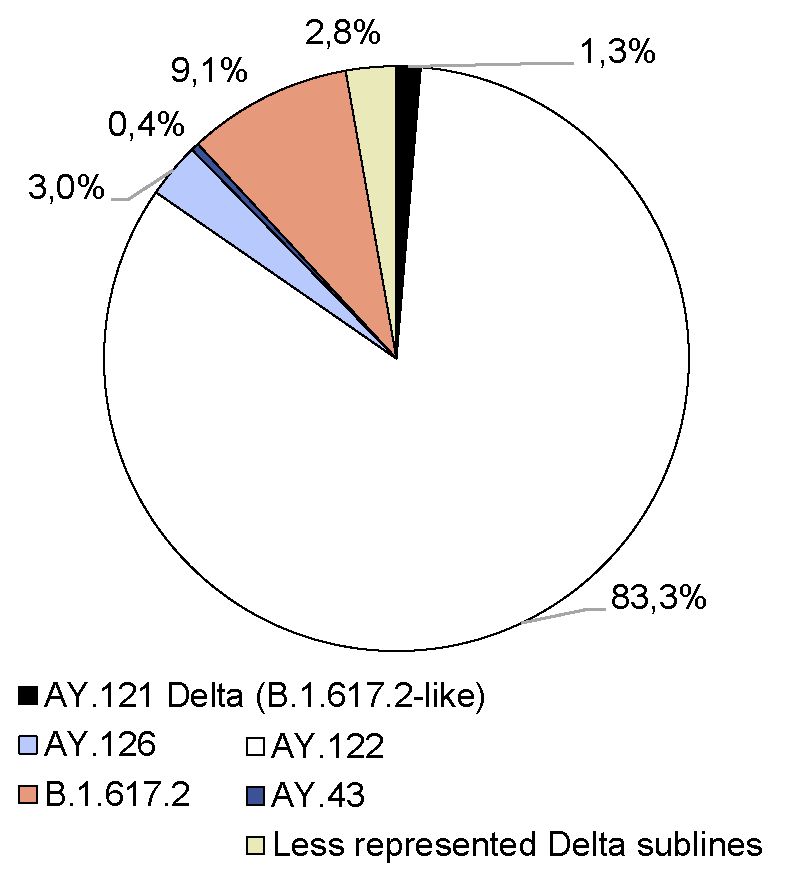 In addition to AY.122, the most frequently occurred Delta subvariants were represented by the "parental" B.1.617.2 (9.1%), AY.126 (3,0%), and others. Other subvariants were of rare occurrence, accounting for 4.6% of the total Delta sequences (Fig. 3).