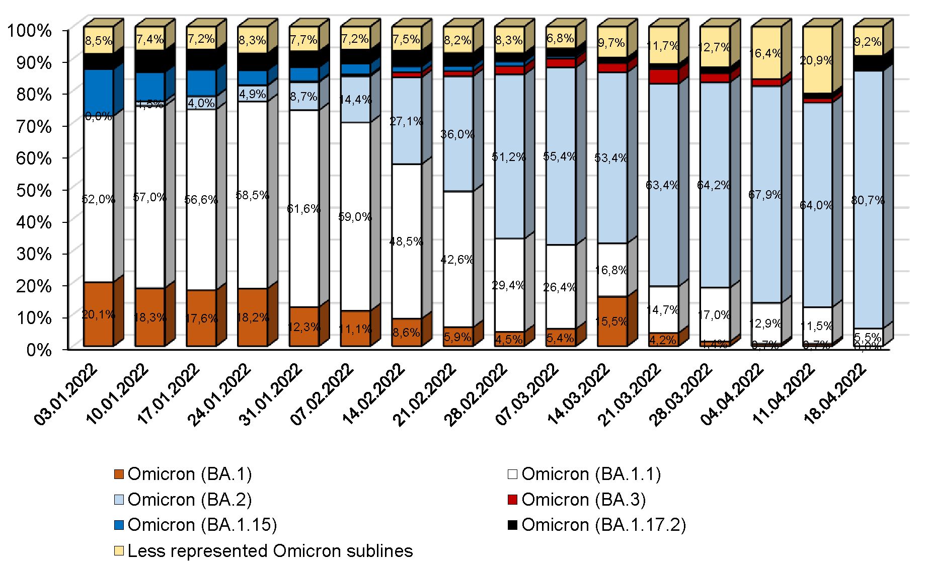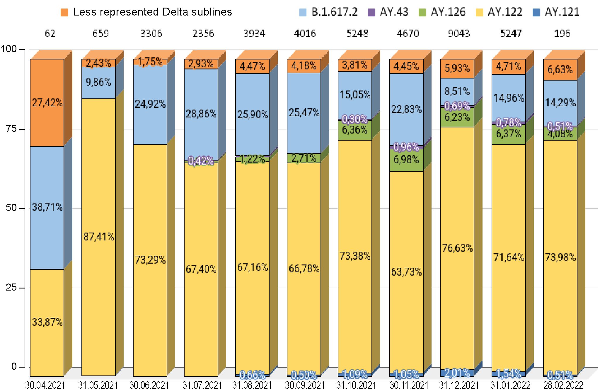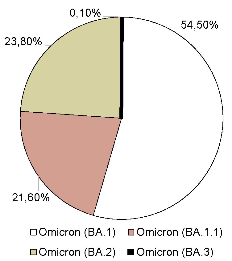 It should be noted that since 1/3/2022 subvariant BA.2 has been dominating in the Omicron lineage (B.1.1.529 + BA.*); its dominance coincided with the decrease in the COVID-19 incidence. It accounts for more than 80% of the total population of subvariants (Fig. 7).