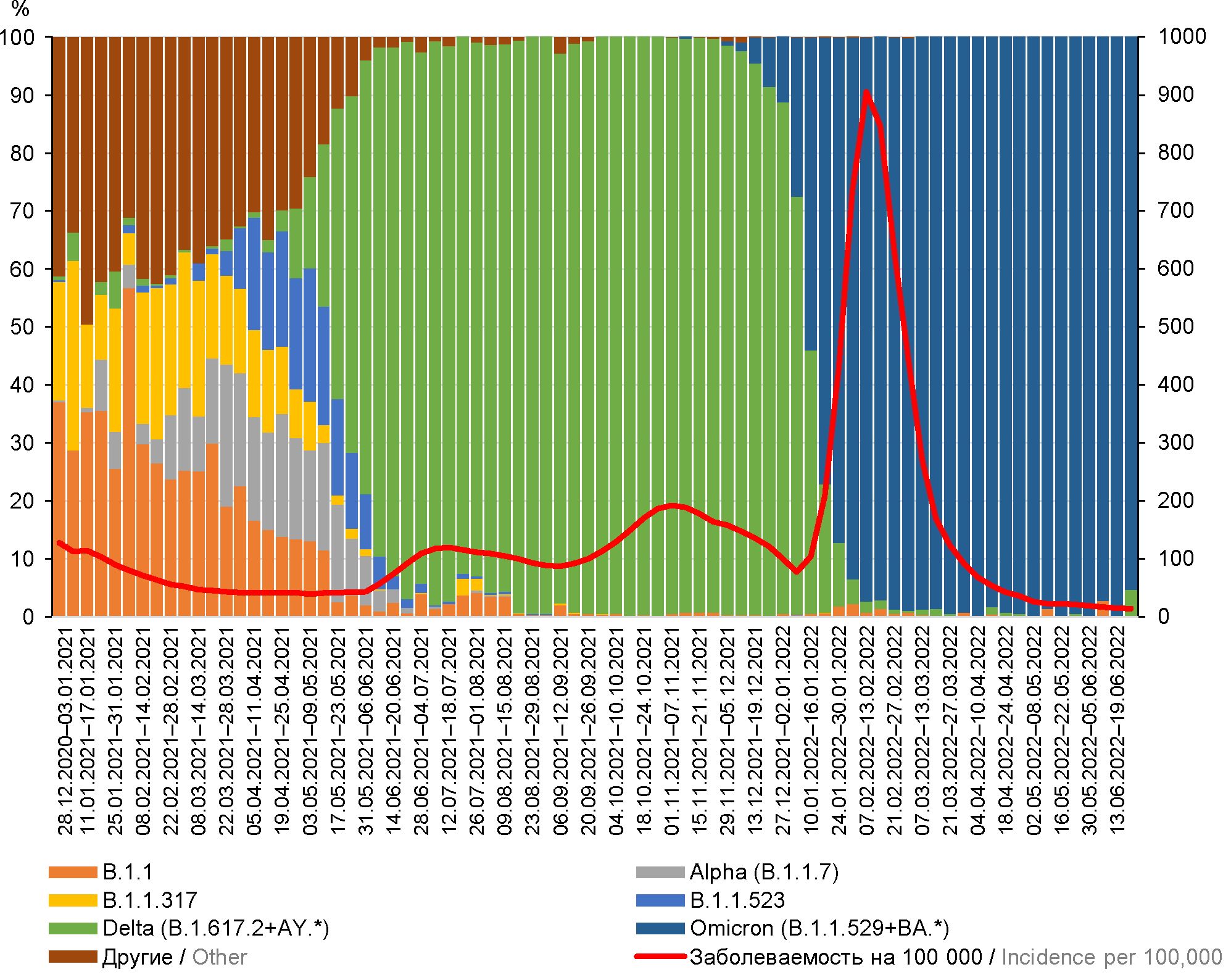 Materials and methods. The analysis of the circulation dynamics for SARS-CoV-2 genetic variants in Russia was carried out, covering the period from 28/12/2020 to 26/6/2022. The analysis included the data from Rospotrebnadzor Report No. 970 "Information about Infectious Diseases in Individuals with Suspected Novel Coronavirus Infection" and the Virus Genome Aggregator of Russia (VGARus). The presence of SARS-CoV-2 RNA was confirmed by the real-time reverse transcription polymerase chain reaction. The primer panels developed at the Central Research Institute of Epidemiology were used for amplification of genomic fragments and the subsequent sequencing.