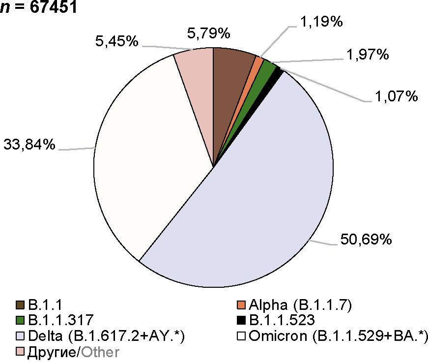 The whole-genome sequencing of SARSCoV-2 genetic variants was performed in Russia from 28/12/2020 to 26/6/2022, using the VGARus database. It confirmed the dominance of Delta and Omicron genetic variants and demonstrated that from May to December 2021, the Delta genetic variant (B.1.617.2 + AY.*) was dominant in Russia, while subvariant AY.122 prevailed (83.3%). The Omicron variant started its rapid spread in December 2021, including dissociation of the Omicron genetic lineage and dominance of subvariants BA.1, BA.1.1, and BA.2. The BA.3 sublineage was of rare occurrence and currently accounts for less than 0.1% of the total Omicron population. The proportion of the BA.2 sublineage is gradually increasing (accounting for 80% of the Omicron sublineages isolated during the 16th–17th week in 2022). In Russia, a few BA.4 and BA.5 genetic variants have been detected; they have not developed into epidemic forms, causing asymptomatic or mild cases of acute respiratory viral infection.