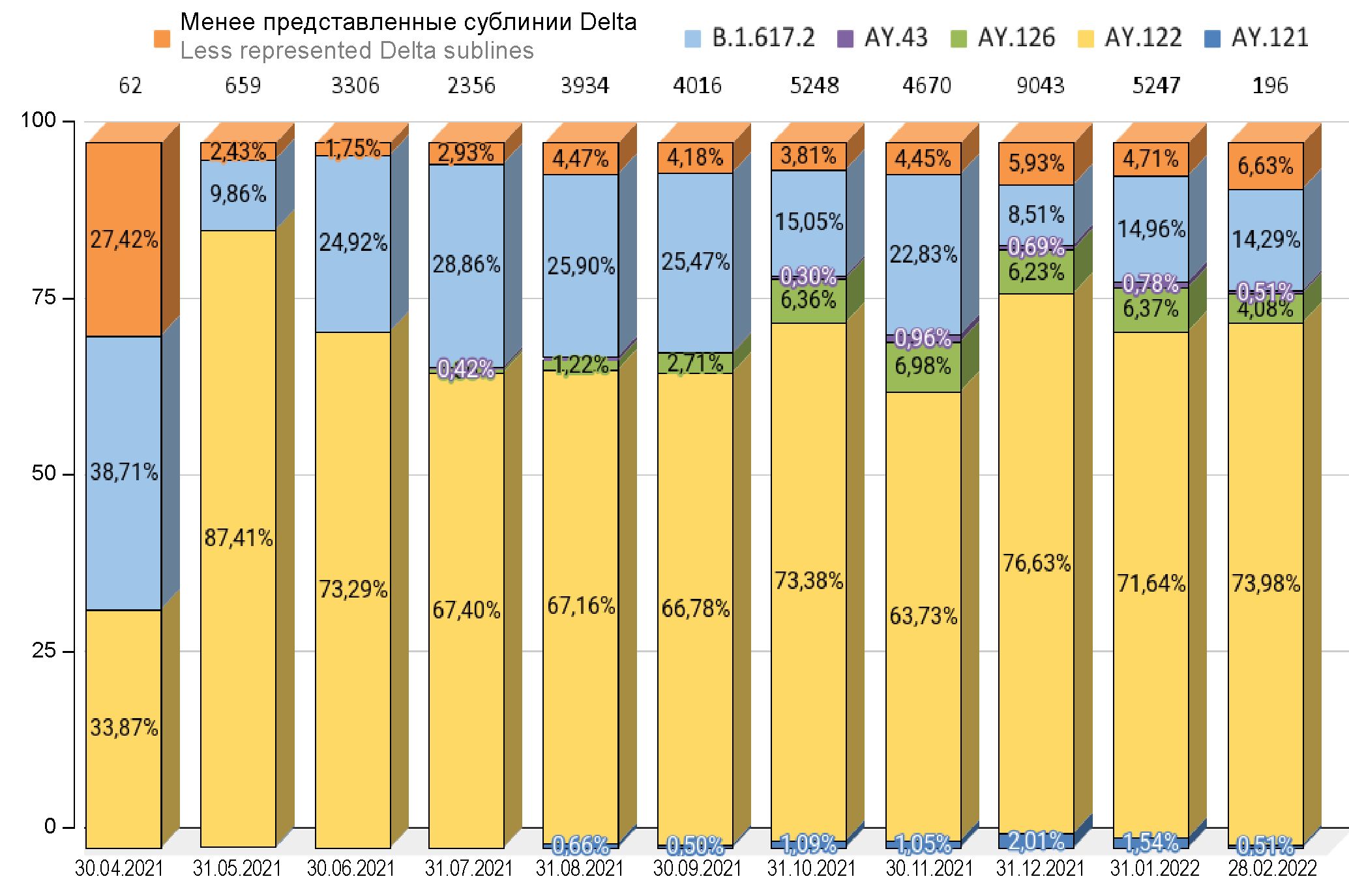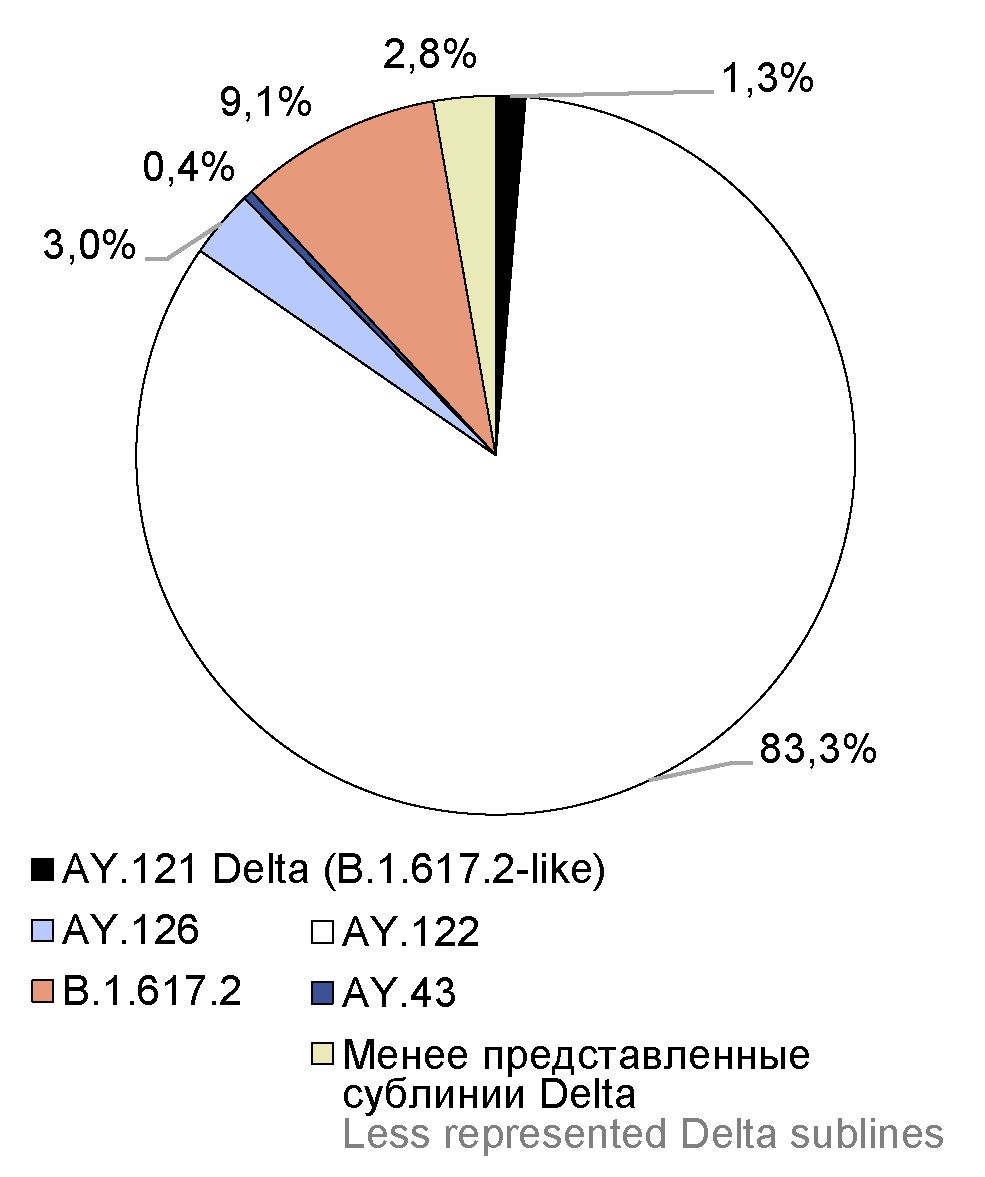 The analysis of the dynamics of subvariants of the Delta lineage (B.1.617.2 + AY.*), which were isolated in Russia, showed that in May 2021, the Delta lineage was mainly represented by B.1.617.2 (38.7%) and AY.122 (33.8%) sublineages and less frequently occurring sublineages; after their dissociation, the AY.122 sublineage accounted for 80% of the total population (Fig. 5).