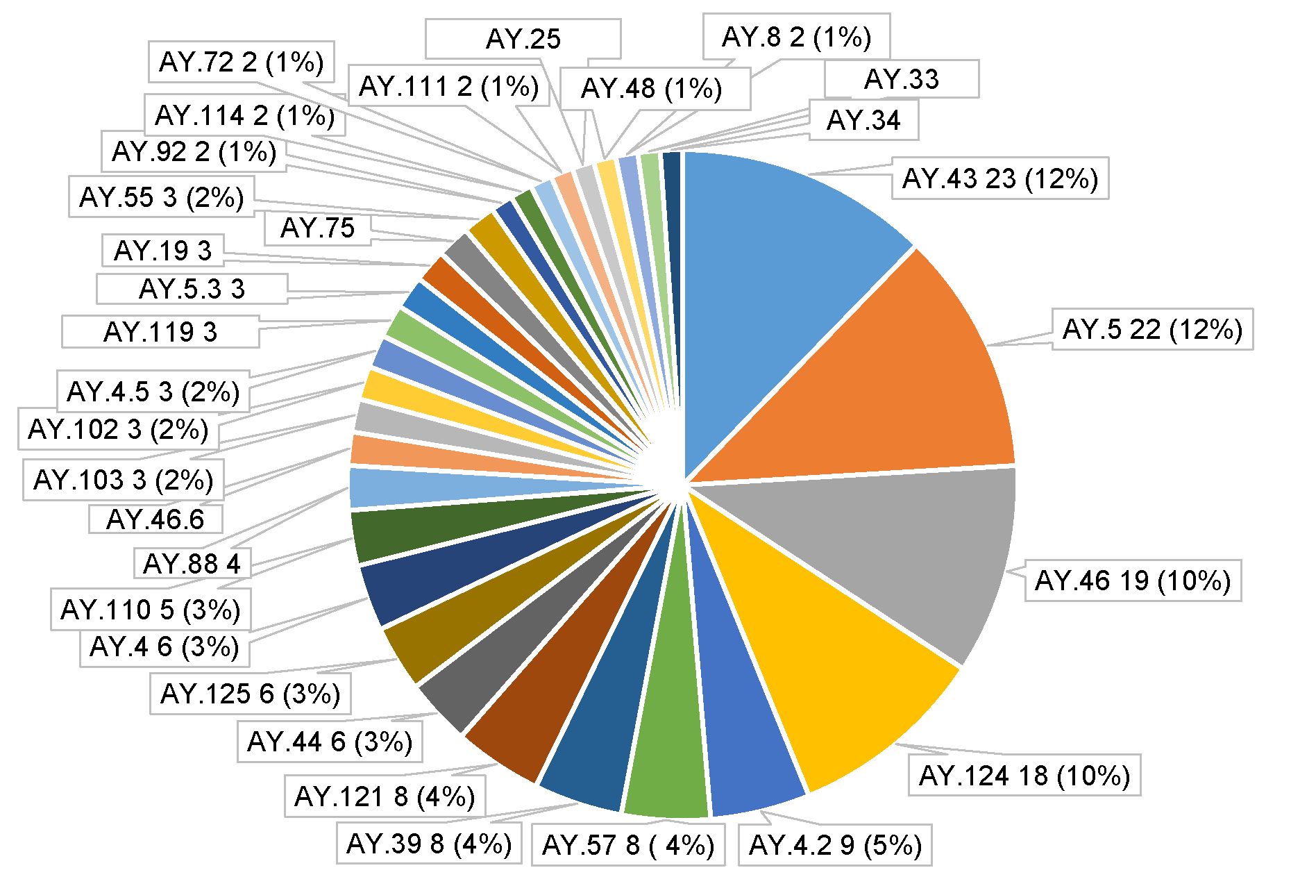 In addition to AY.122, the most frequently occurred Delta subvariants were represented by the "parental" B.1.617.2 (9.1%), AY.126 (3,0%), and others. Other subvariants were of rare occurrence, accounting for 4.6% of the total Delta sequences (Fig. 3).