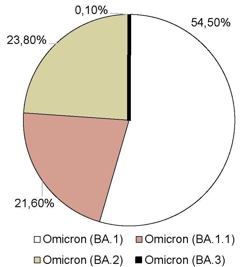 The Omicron variant has been rapidly spreading since December 2021; currently, it is the dominant variant in Russia (100% of all the studies specimens). The analysis of the data from the national VGARus database helped reveal the dissociation of the gentic Omicron lineage in Russia with the most frequently circulating subvariants BA.1 (54.5%), BA.1.1 (21.7%), and BA.2 (23.8%). Subvariant BA.3 was of rare occurrence and currently accounts for less than 0.1% of the total Omicron population (Fig. 6).