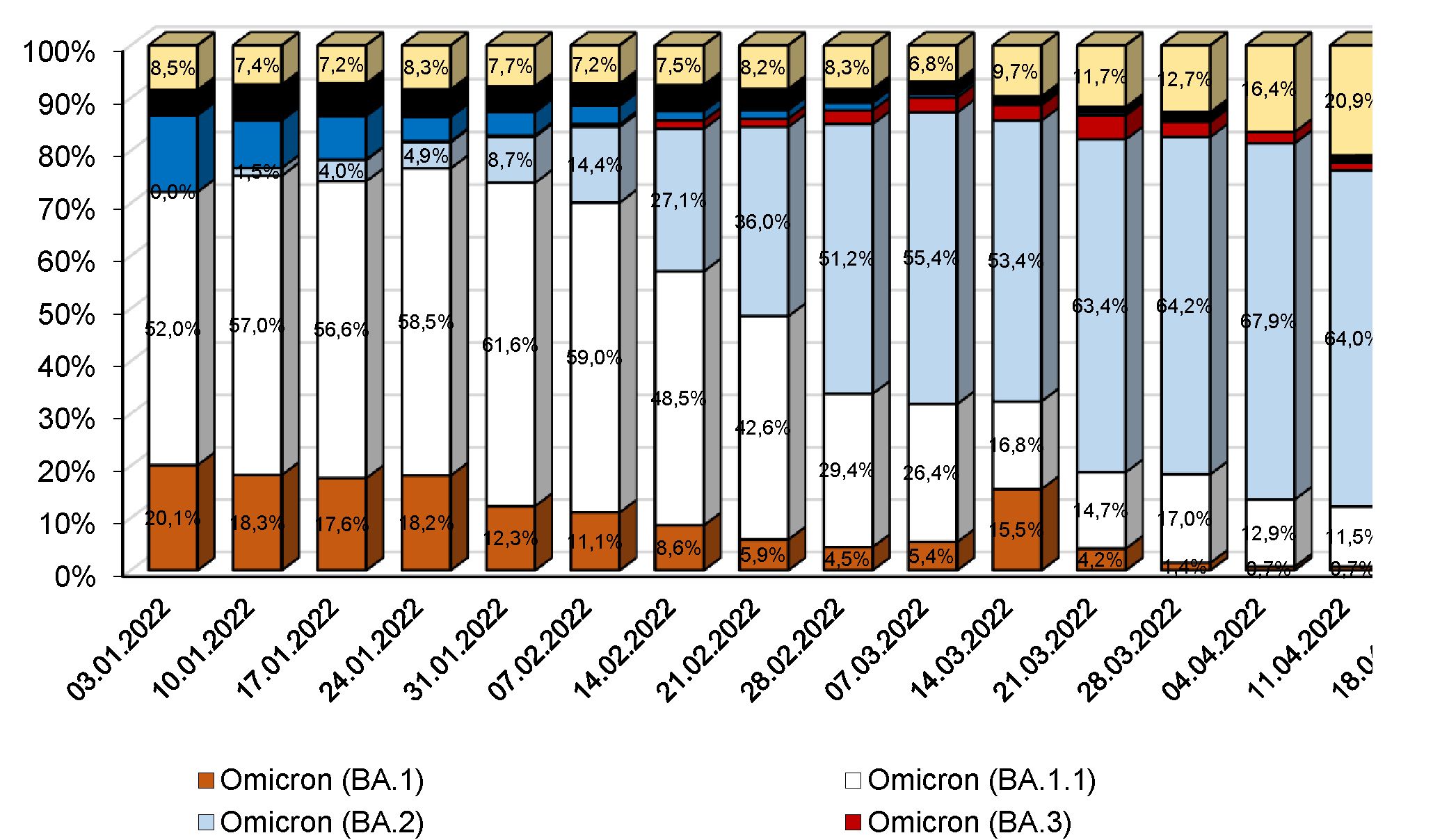It should be noted that since 1/3/2022 subvariant BA.2 has been dominating in the Omicron lineage (B.1.1.529 + BA.*); its dominance coincided with the decrease in the COVID-19 incidence. It accounts for more than 80% of the total population of subvariants (Fig. 7).