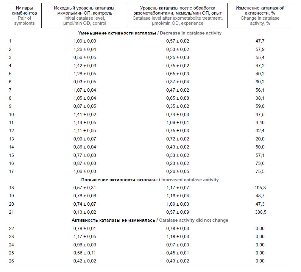 Results. Klebsiellas decrease the intensity of germ tube formation in C. albicans by 58.7% (p < 0.01). When cocultured, 12.3% of the yeast cells produce germ tubes, while 29.8% of transformed cells was detected in the fungal monoculture. It has been found that exometabolites of 65.7% of E. faecalis strains decrease production of catalase in C. albicans. The initial catalase level in untreated cultures of C. albicans averages 1.02 µmol/min of optical density; after they are treated with E. faecalis exometabolites, the level decreases to 0.55 µmol/min, i.e. by 46.1% (p < 0.05).