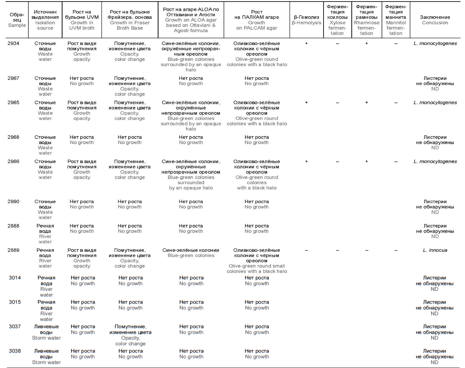После постановки дополнительных тестов для всех эскулинположительных культур микроорганизмов, выросших на среде ПАЛКАМ, и лецитинобразующих культур на среде ALOA — пo Оттавиани и Агости, подтверждена принадлежность культур из образцов № 2934, 2965, 2966, выделенных из сточных вод, к L. monocytogenes, а культуры из образца № 2889, выделенного из речной воды, — к L. innocua. В остальных образцах воды из водных объектов Вологодского района Вологодской области бактерии рода Listeria не обнаружены (табл. 1).