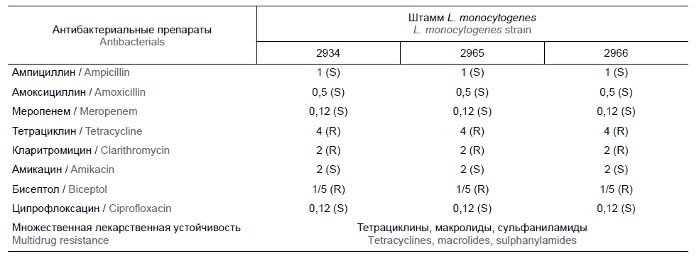 На основании определения МПК АМП три штамма L. monocytogenes отнесены к категории MDR, в соответствии с критериями [15], т.е. устойчивы к АМП 3 и более классов. Все штаммы были устойчивы к тетрациклинам (тетрациклину), макролидам (кларитромицину) и сульфаниламидам (бисептолу). Эти штаммы чувствительны к меропенему, амикацину и ципрофлоксацину (табл. 2).
