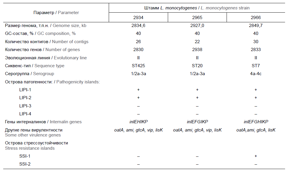 При анализе полногеномных последовательностей штаммов L. monocytogenes 2934, 2965, 2966 показано, что гены островов патогенности LIPI-1 и LIPI-2 присутствуют у всех 3 штаммов, гены LIPI-3 и LIPI-4 отсутствуют. На этом основании можно предположить, что штаммы не являются гипервирулентными, т.к. ранее отмечено, что наличие островов патогенности LIPI-3 и LIPI-4 характерно для гипервирулентных штаммов L. monocytogenes [18]. Гены кластера интерналинов inlE, inlI, inlK, inlP детектированы у всех штаммов, гены inlF, inlG — у штаммов L. monocytogenes 2934 и 2965, ген inlH — у штаммов L. monocytogenes 2934 и 2966. Прочие гены патогенности листерий (oatA, ami, gtcA, vip, lisK) детектированы у всех 3 штаммов, кроме гена vip, который отсутствовал у штамма L. monocytogenes 2966.