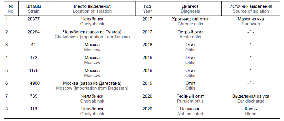 Наш интерес к НАГ-вибрионам, вызвавшим отиты, обусловлен тем, что в 2017–2020 гг. такие штаммы выделялись из отделяемого уха больных на территории России.