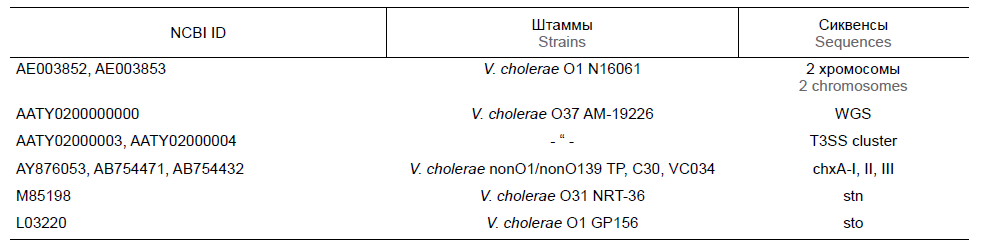 Отдельные гены и их кластеры идентифицировали в полных геномах с помощью программ «BLASTN v. 2.2.29»1 и «BioEdit v. 7.2.5»2. Трансляцию генов, сравнительный анализ их нуклеотидных последовательностей и аминокислотных (аа) продуктов осуществляли с использованием пакета программ «Vector NTI Advance 11» («Invitrogen»). Прототипами служили соответствующие последовательности референс-штамма V. cholerae N16061 и другие, отсутствующие в его геноме (табл. 2). Для определения наличия и локализации активных доменов в белках, а также выявления их гомологов у штаммов из других регионов мира выполняли BLASTP-анализ.