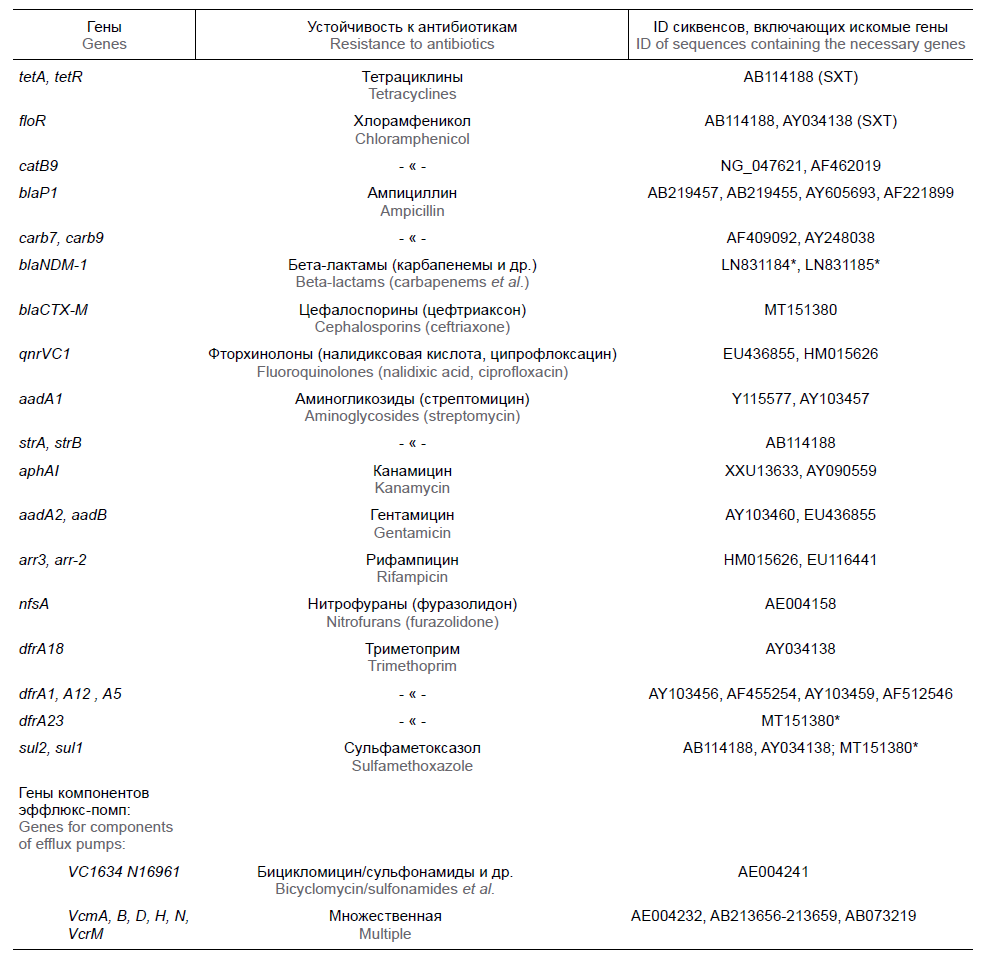 Таблица 3. Гены, использованные для идентификации детерминант антибиотикорезистентности в WGSs НАГ-вибрионов