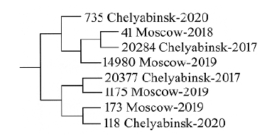 Как видно из рис. 1, все штаммы различались между собой по содержанию SNP, хотя некоторые обладали более выраженным сходством друг с другом и образовали несколько кластеров, что указывает на отсутствие общих источников инфицирования даже в случаях одного места и времени выделения.