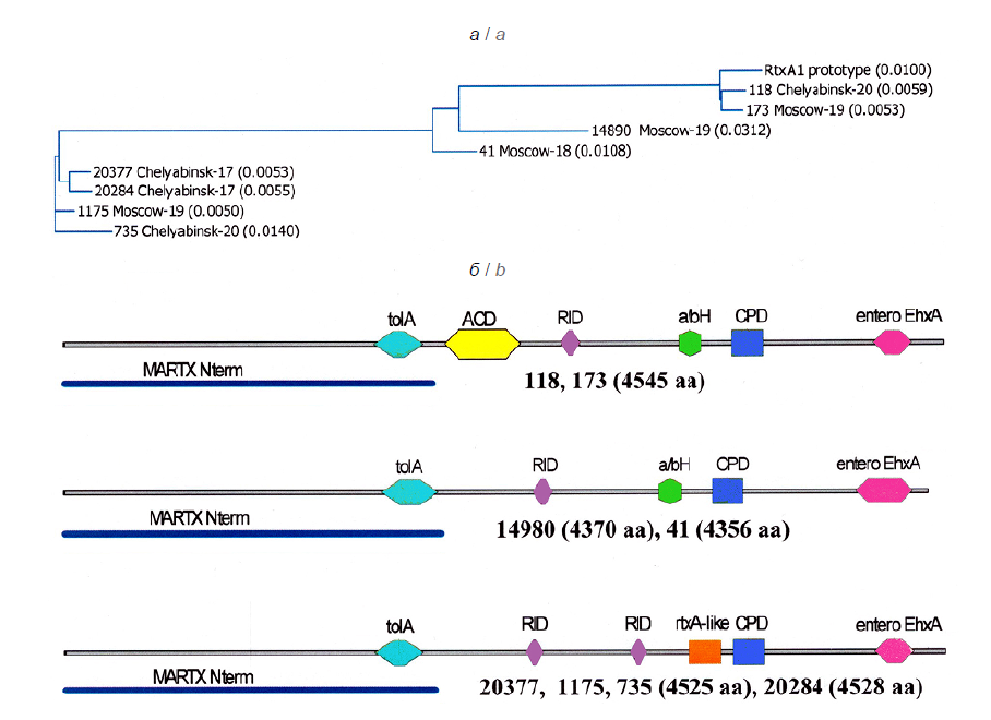Интактный кластер RTX, ответственный за синтез цитотоксина-актиномодулятора MARTX, присутствовал у всех штаммов, однако ген собственно токсина rtxA отличался значительной вариабельностью по длине и числу молчащих и миссенс-мутаций, что отразилось на аа-составе продуктов разных аллелей. Как видно из рис. 2, только у 2 штаммов белки MARTX оказались наиболее близкими прототипному RtxA1 и содержали все характерные для него активные домены: актин-связывающий (ACD), инактивирующий Rho-ГТФазу (RID), цистеиновой протеазы (CPD) и α-β-гидролаз (α/βH), два других отличались от них не только длиной, но и отсутствием ACD. Белки оставшихся 4 штаммов, лишенные не только ACD, но и α/βH, содержали по 2 RID. Кроме того, у них появился новый домен, описанный программой «BLASTP» как «rtxA-подобный». На дендрограмме они образовали отдельный кластер.