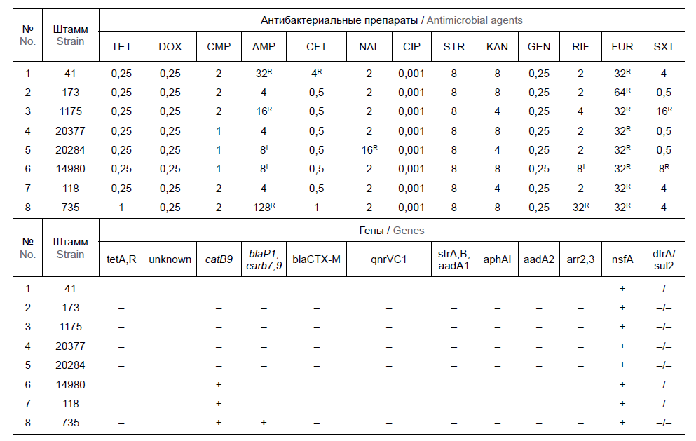 Примечание. TET — тетрациклин, DOX — доксициклин, CMP — хлорамфеникол, AMP — ампициллин, CFT — цефтриаксон, NAL — налидиксовая кислота, CIP — ципрофлоксацин, STR — стрептомицин, KAN — канамицин, GEN — гентамицин, RIF — рифампицин, FUR — фуразолидон, SXT — триметоприм/сульфаметоксазол.У всех штаммов также выявлены гены эффлюкс-помп VC1634, vcmABDHN, vcrM и не выявлены SXT, интегроны 1 класса и плазмиды. R — устойчивость, I — промежуточная устойчивость; остальные значения соответствуют чувствительности в соответствии с МУК 4.2.2495-09.