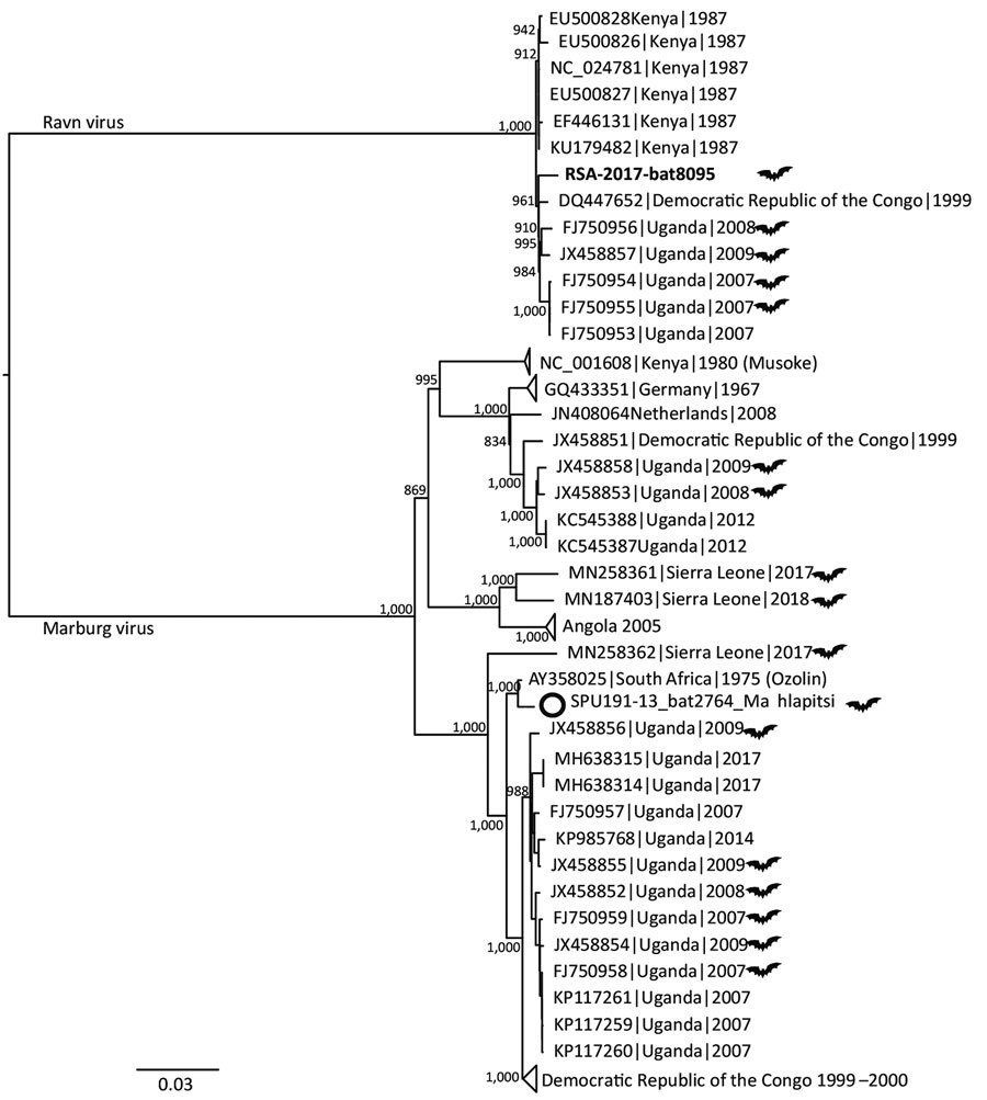 Рис. 1. Филогения рода Marburgvirus. Филогенетическое древо показывает эволюционные отношения видов возбудителя. Указаны регистрационные номера изолятов в GenBank. Изоляты, выделенные из летучих мышей, показаны с использованием символа летучей мыши. Шкала показывает нуклеотидные замены на сайт [7].