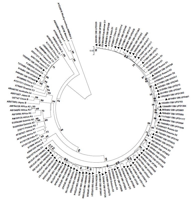 Phylogenetic analysis of the HBV complete genomic nucleotide sequences from blood donors compared to reference sequences from the GenBank international database. The reference sequences have the assigned GenBank codes showing the genotype and the region of the sample. Nucleotide sequence AY226578 of woolly monkey HBV was used as an out-group. The studied samples are marked with black triangles. The phylogenetic tree was constructed using the neighbor-joining method. Bootstrap values ≥ 60 are used.