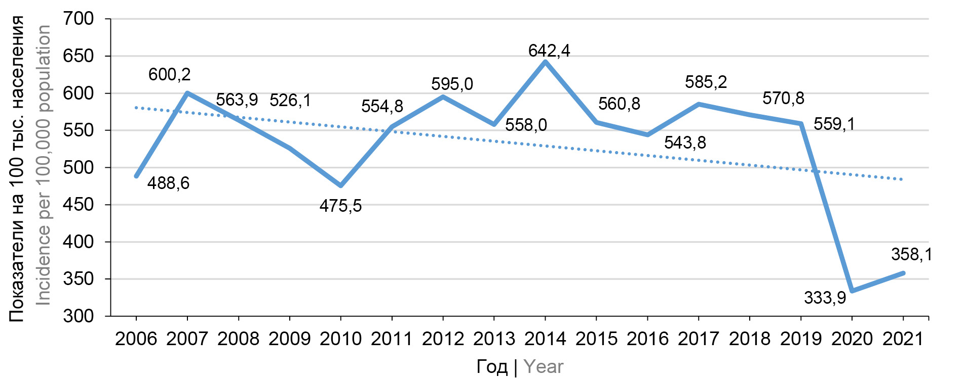 Рис. 1. Динамика заболеваемости ВО в России в 2006–2021 гг. / Fig. 1. Dynamics of CP incidence in Russia in 2006–2021.