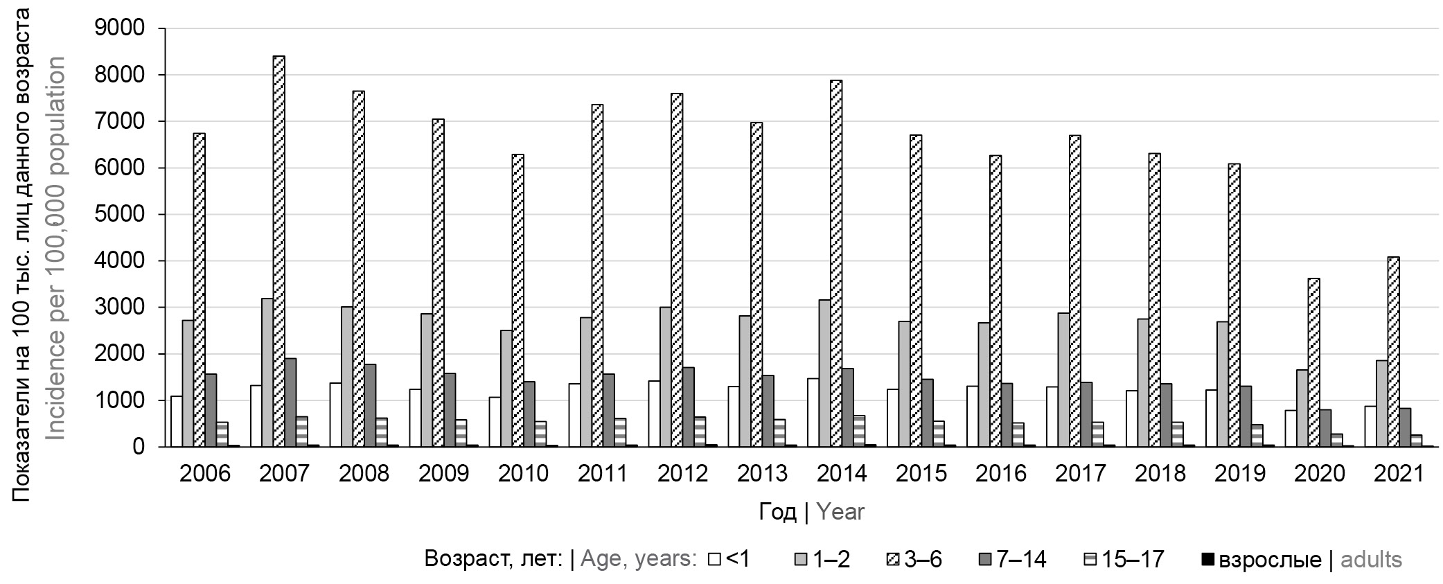Наиболее высокие уровни заболеваемости ВО обычно регистрировались среди детей дошкольного возраста: в возрастной группе 3–6 лет ежегодные показатели достигали 6–8 тыс. на 100 тыс. детей данной возрастной группы, среди детей 1–2 лет — 2,5–3,0 тыс. на 100 тыс. детей данного возраста. В 2020 г. снижение заболеваемости наблюдалось во всех возрастных группах населения, в 2021 г. отмечен рост заболеваемости на 15% также во всех возрастных группах (рис. 2).