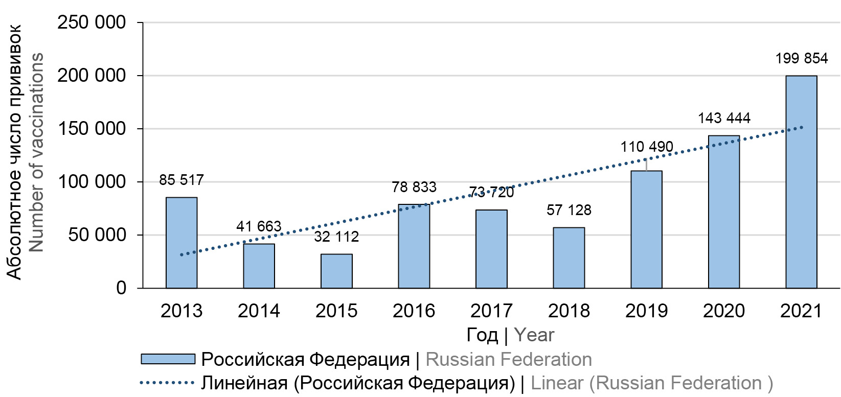Согласно официальным статистическим данным, с 2013 по 2021 г. в России было проведено более 850 тыс. прививок против ВО. Ежегодно вакцинировали 32,0–199,8 тыс. человек (рис. 3).