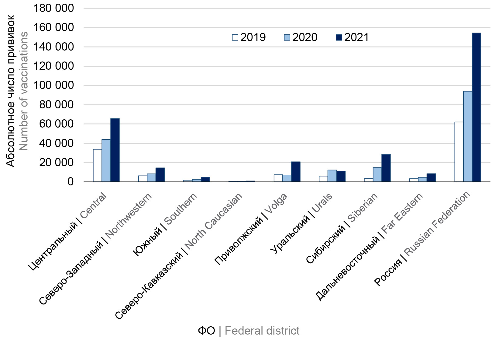 Рис. 4. Число выполненных прививок против ВО детскому населению России и в ФО РФ в 2019–2021 гг. / Fig. 4. The number of children vaccinated against CP in Russia and its FDs in 2019–2021.