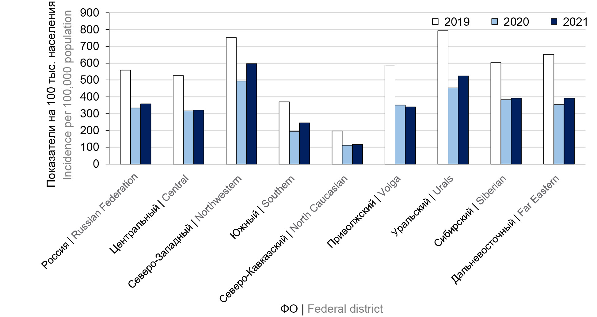 Рис. 5. Заболеваемость ВО в России и в ФО РФ в 2019–2021 гг. / Fig. 5. CP incidence in Russia and its FDs in 2019–2021.