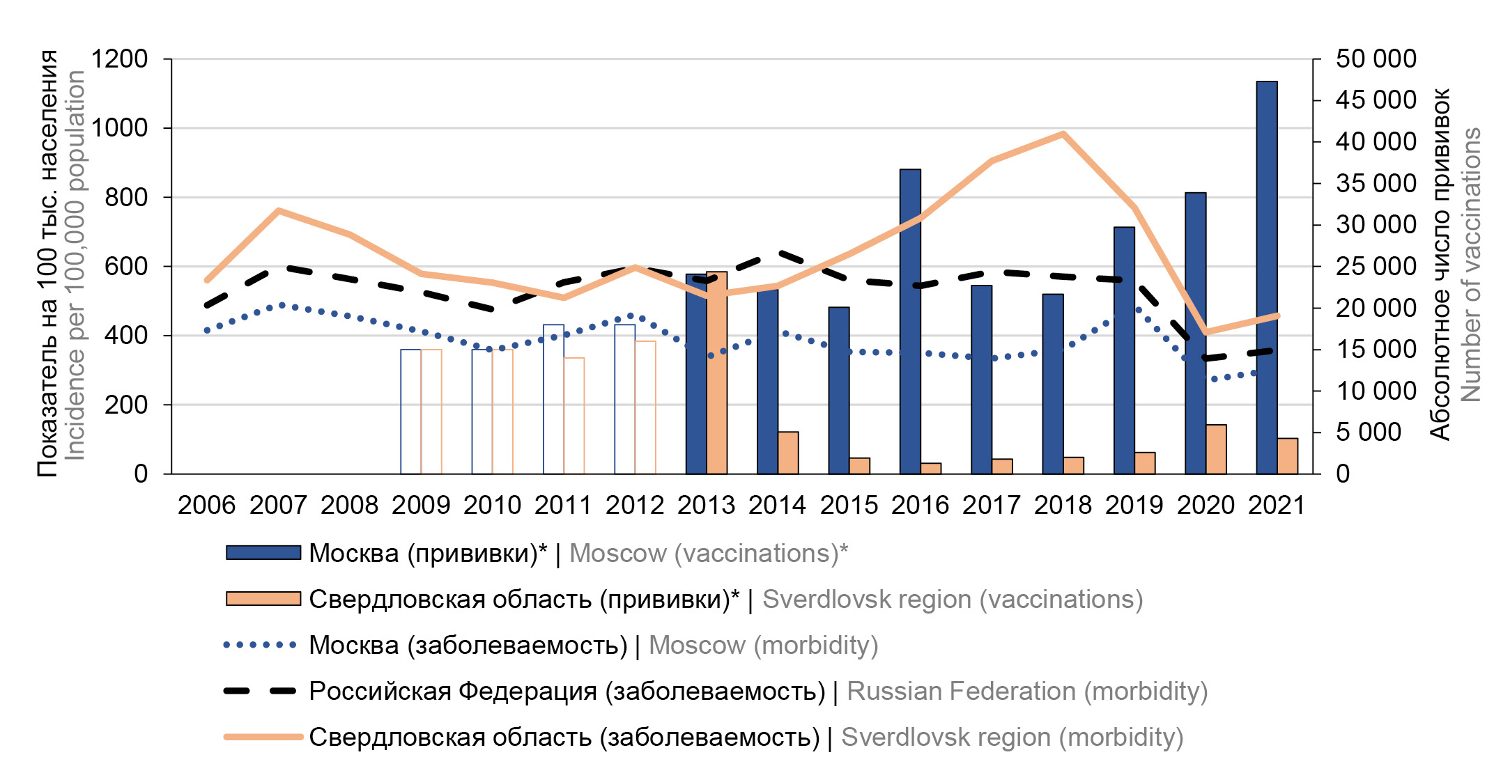 Рис. 6. Заболеваемость ВО и объём профилактической иммунизации в Москве и в Свердловской области в 2006–2021 гг. Примечание: *столбики без окраски за 2009–2012 гг. — данные из неофициальных отчётов и экстраполированные данные, полученные на основе неполных опубликованных данных. / Fig. 6. CP incidence and preventive immunization coverage in Moscow and the Sverdlovsk Region in 2006–2021. Note. *non-highlighted columns show data for 2009–2012 from unofficial reports and extrapolated data from incomplete published information.