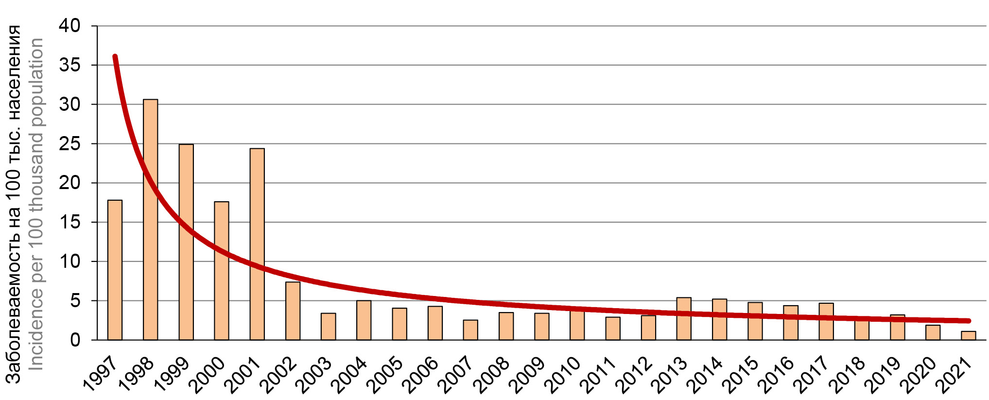 В начале 1980-х гг. в Республике Татарстан заболеваемость ВГА достигала 200 случаев на 100 тыс. населения, в 1998 г. уровень заболеваемости составил 30,6о/оооо, в 2006–2021 гг. — 1,1–5,4о/оооо с тенденцией к снижению (средний многолетний уровень — 3,6 ± 0,3о/оооо; рис. 1).