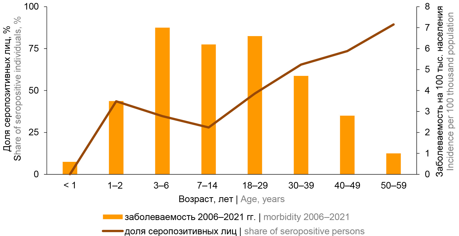 Эпидемический процесс (2006–2021 гг.) определяют лица в возрасте 15–17 лет (8,2 ± 2,5о/оооо), 3–6 лет (7,0 ± 1,9о/оооо), 7–14 лет (6,2 ± 1,3о/оооо), уровень заболеваемости среди данных возрастных групп за все наблюдаемые годы оставался наиболее высоким. Низкая интенсивность заболеваемости — в возрастных группах старше 60 лет (0,1 ± 0,1о/оооо), среди детей до 1 года (0,6 ± 1,1о/оооо), 50–59 лет (1,0 ± 0,9о/оооо), 40–49 лет (2,8 ± 0,7о/оооо), 1–2 года (3,5 ± 1,9о/оооо). Таким образом, проведённый анализ показал различную интенсивность эпидемического процесса среди детского и взрослого населения с превышением заболеваемости среди детей в 2,3 раза (6,9 ± 0,9 и 3,0 ± 0,3о/оооо).