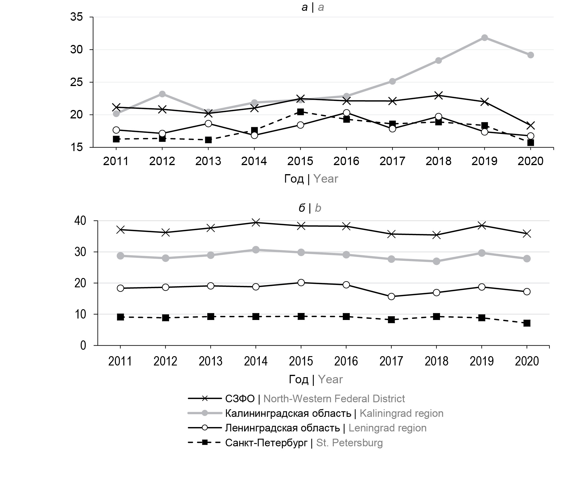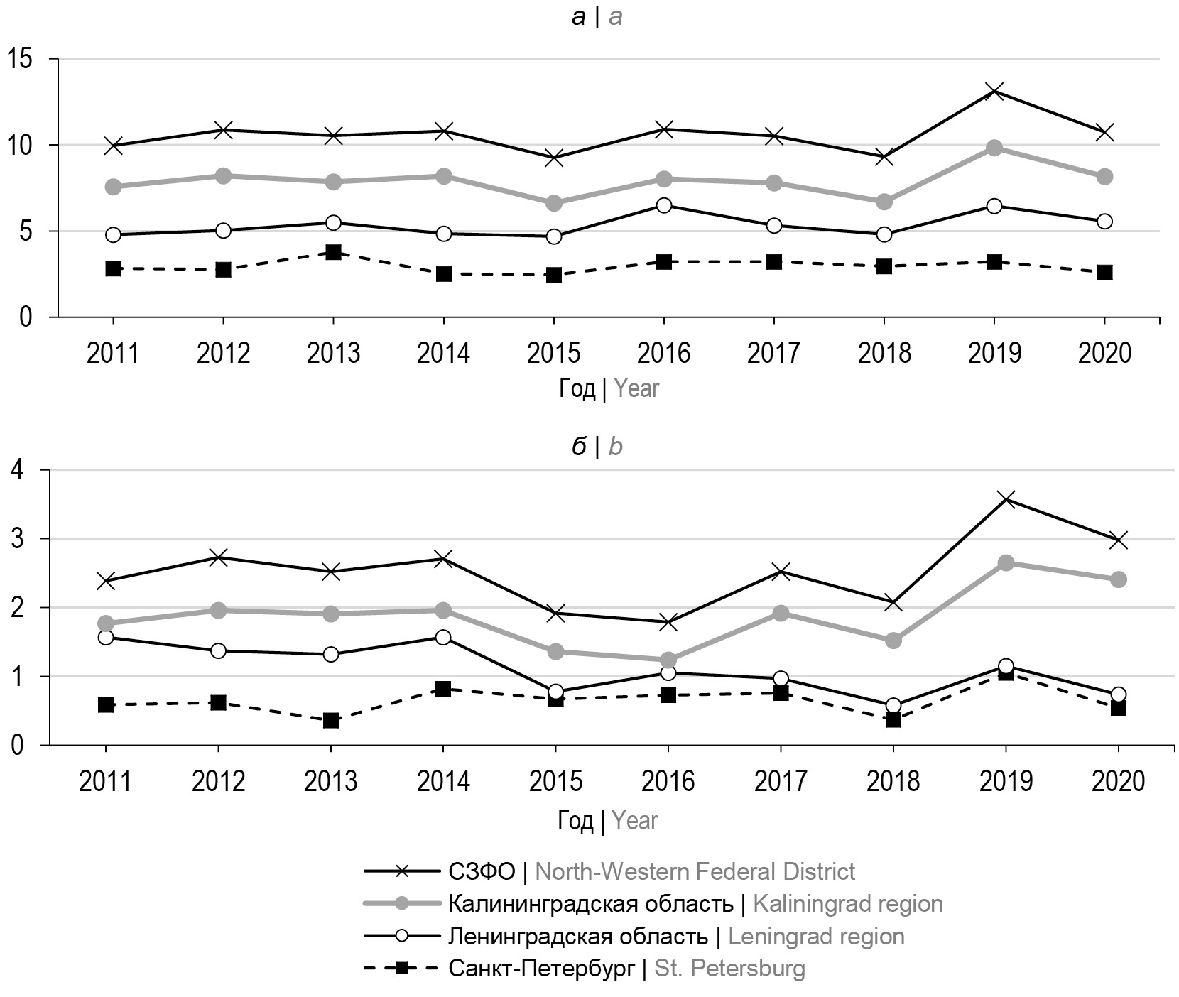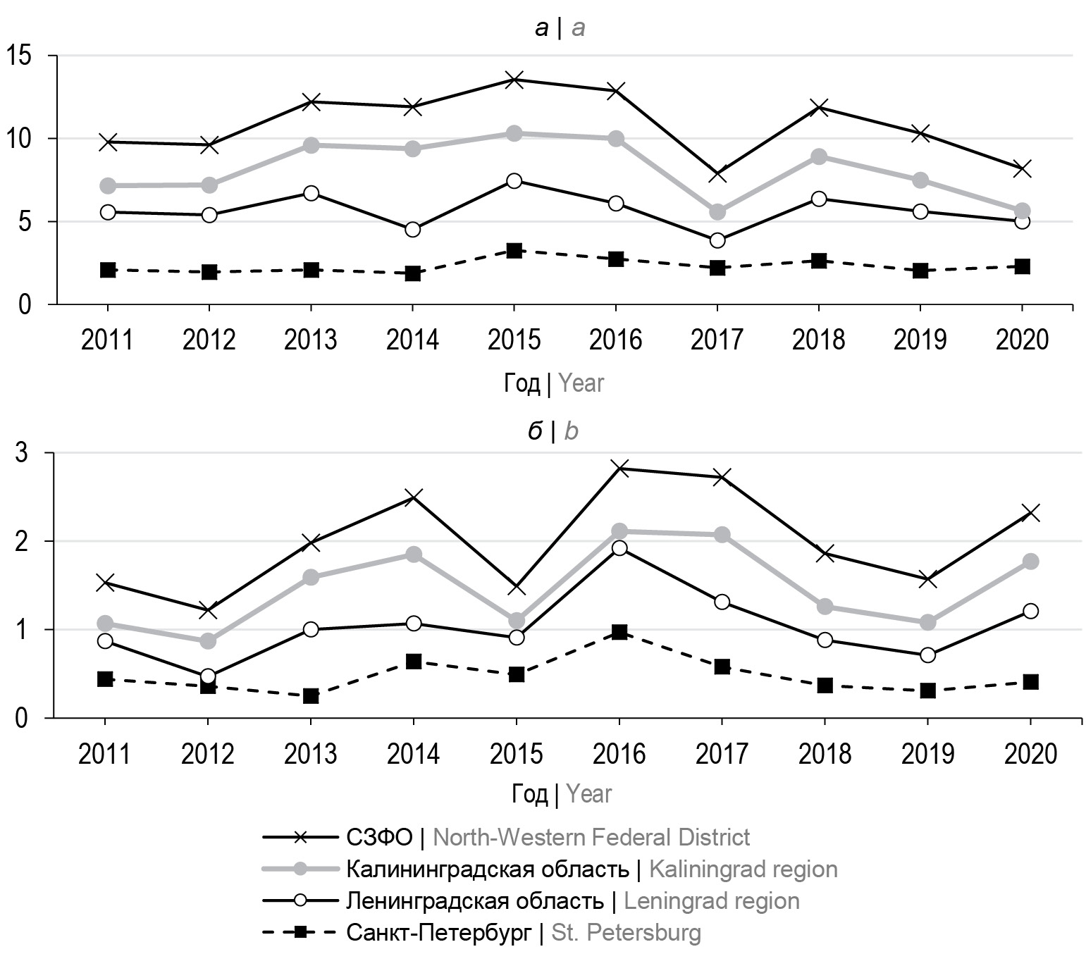 Fig. 2. Oropharyngeal cancer incidence among male (a) and female (b) populations in the regions of the North-Western Federal District of Russia in 2011–2020, рer 100,000 population.