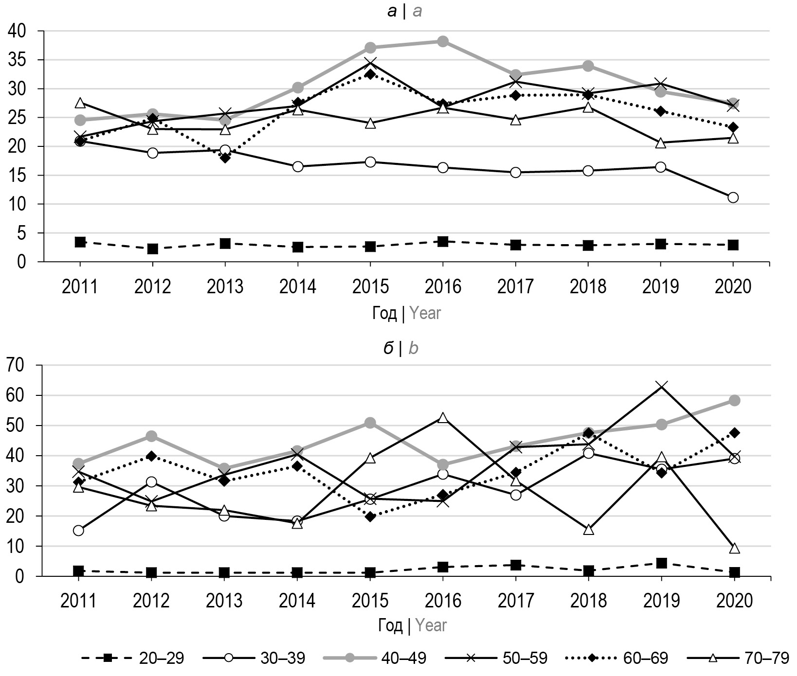 Fig. 4. Cervical cancer incidence in various age groups of the female population of St. Petersburg (а) and Kaliningrad region (b) in 2011–2020, рer 100,000 female population the same age.