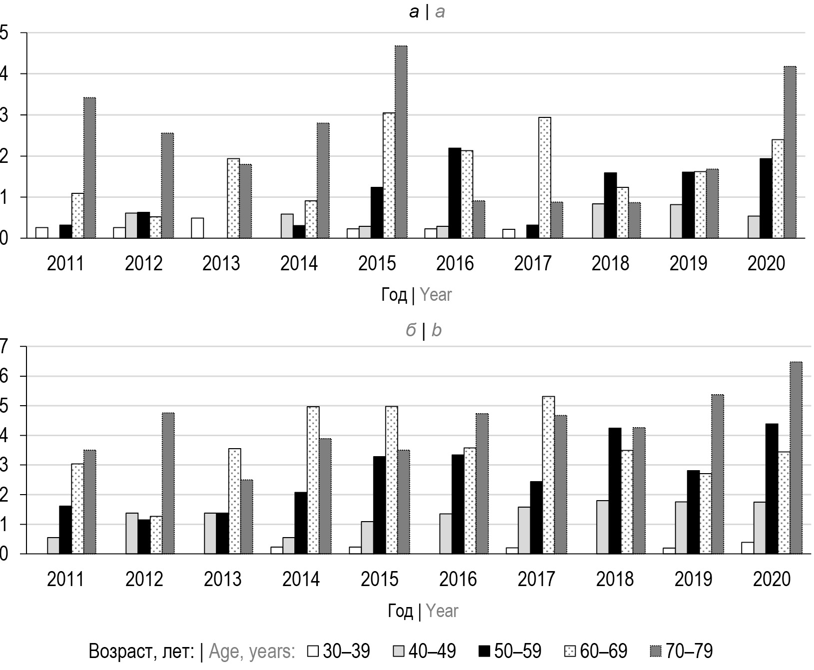 Рис. 5. Заболеваемость раком анального канала в различных возрастных группах мужского (а) и женского (б) населения Санкт-Петербурга в 2011–2020 гг.