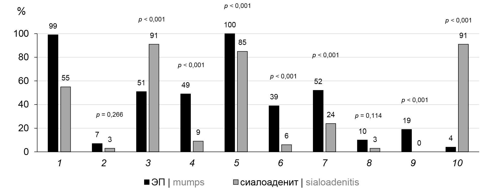 Среди выявленных клинико-лабораторных показателей определён перечень признаков, статистически достоверно чаще отмечавшихся у пациентов с ЭП в сравнении с больными НСА: общая слабость, повышение температуры до фебрильных цифр, припухлость околоушных слюнных желёз с обеих сторон, боль в околоушной области, сухость во рту, орхит, повышение уровня амилазы в крови, лейкопения, лимфоцитоз, повышение уровня диастазы в моче. Перечисленные клинико-лабораторные признаки были закодированы бинарно: наличие либо отсутствие патологического клинического симптома или лабораторного показателя (для каждого пациента относительно его возрастной физиологической нормы). При этом проводили расчёт чувствительности и специфичности для каждого клинического признака. Чувствительность показателей варьировала от 19 до 100%, специфичность — от 15 до 100%. Сочетание приоритетных клинико-лабораторных показателей, имеющих наибольшую связь с диагностической вероятностью наличия у пациента ЭП, использовали при расчёте вероятности наличия ЭП с помощью уравнения логистической регрессии, описываемого формулой:
