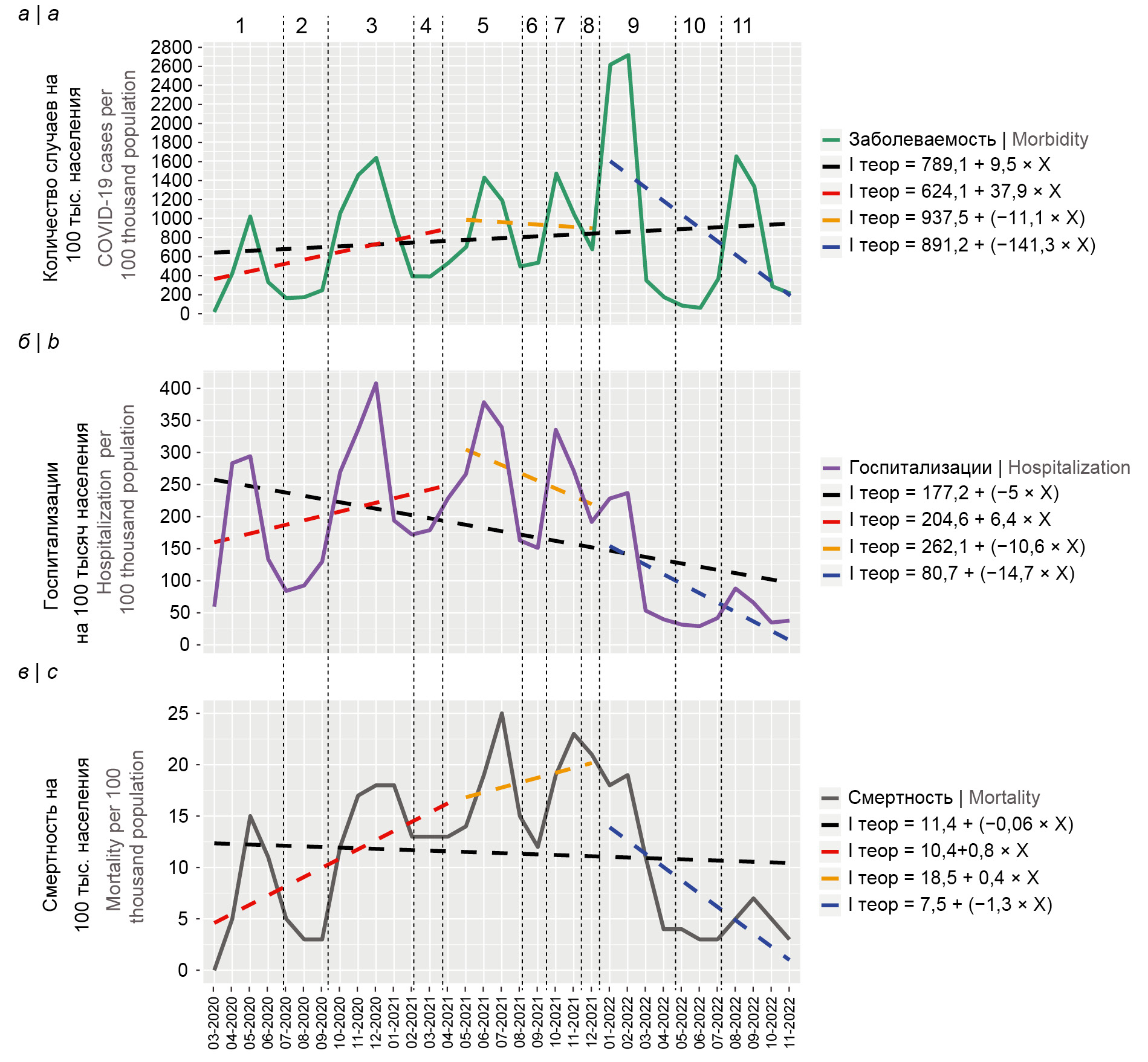 Выполнено описательное сплошное исследование, основным методом которого являлся ретроспективный эпидемиологический анализ, а также статистические методы. Динамику проявлений эпидемического процесса COVID-19 в Москве анализировали за период с марта 2020 г. по октябрь 2022 г. Данные о заболеваемости и смертности были получены c официального интернет-ресурса для информирования населения по вопросам COVID-19 стопкоронавирус.рф и Yandex DataLens, о динамике вакцинации, перенесённом заболевании COVID-19 и госпитализации — с портала Gogov.ru. Всего было проанализировано 3 216 457 случаев заболеваний, 724 284 случая госпитализации и 46 338 случаев смерти, обусловленных COVID-19. Выбранный временнóй отрезок был разделён на периоды динамики заболеваемости, смертности и госпитализации с COVID-19 в Москве. Их границы были определены на основании рассчитанных уровней заболеваемости — были выделены периоды роста и снижения, а также периоды стабилизации уровней заболеваемости (всего 11 периодов). Для полученного временнóго ряда рассчитывали средние значения ряда и ежемесячный темп прироста показателей. Выравнивание ряда проводили методом наименьших квадратов. График содержал динамику показателя, линию тенденции (теоретическая заболеваемость), доверительные границы теоретических показателей (95% доверительный интервал) для оценки тенденции, доверительные границы фактических показателей (95% доверительный интервал) в годы максимального подъёма и предыдущего спада заболеваемости для оценки выраженности колебаний показателей заболеваемости.