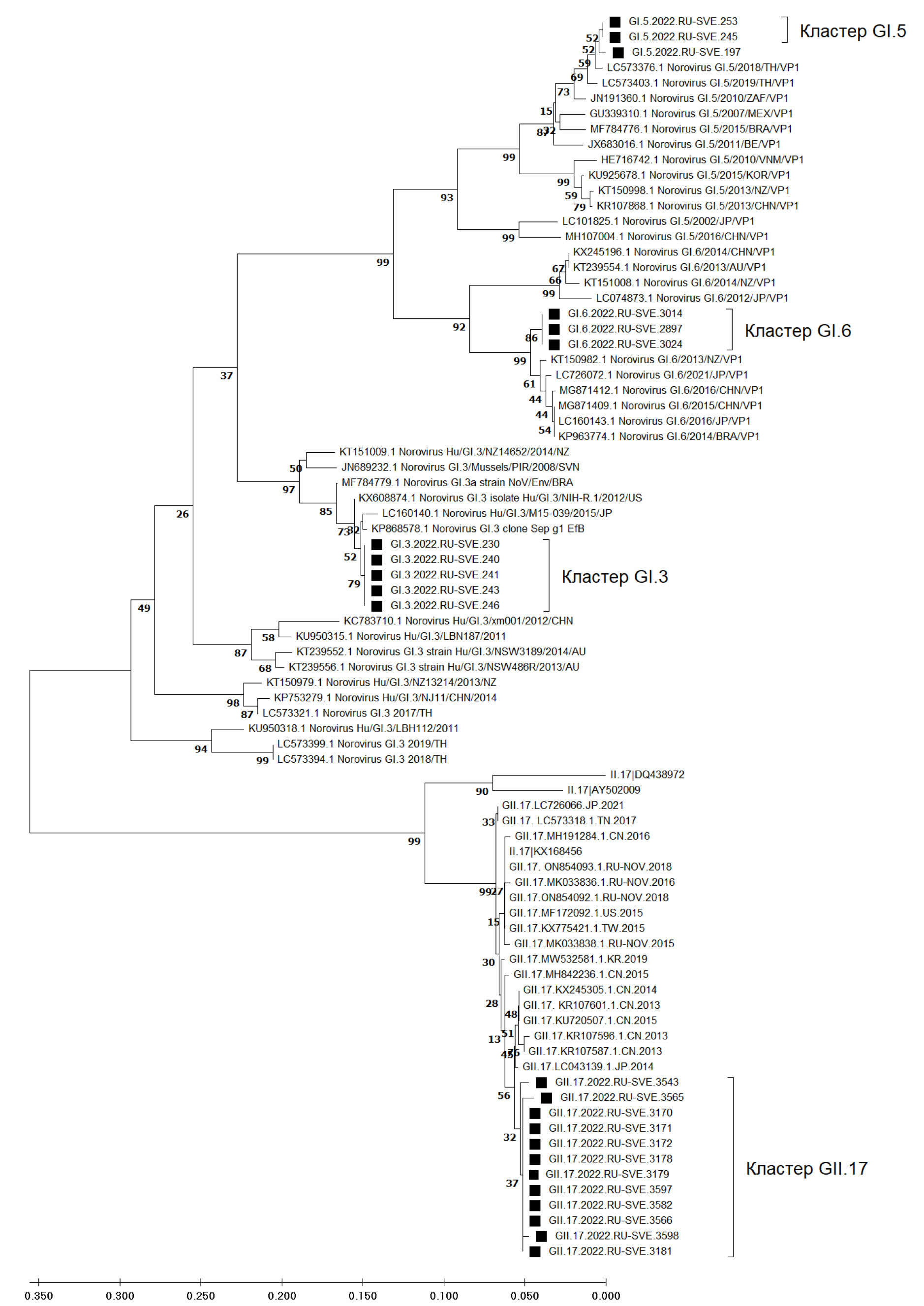 Conclusion. For the first time, a genetic analysis of HuNoV was carried out in the territory of the Sverdlovsk region. The norovirus genotyping system based on the amplification of the ORF1/ORF2 region makes it possible to successfully identify various genotypes of noroviruses from the Sverdlovsk region. It has been confirmed that GII noroviruses remain the dominant genetic group. The results of phylogenetic analysis demonstrate the greatest homology in the formed clusters between isolates from Ekaterinburg, Nizhny Tagil, Kamensk-Uralsky.