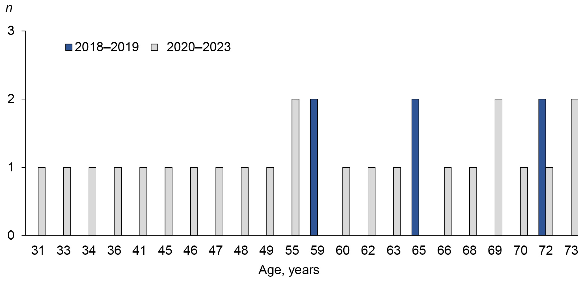 The minimum age of patients in this cohort decreased to 31 years (Fig. 1). The proportion of patients under 59 years of age was 34%. At the same time, the proportion of deaths in the study group increased 1.57-fold (from 36% before the pandemic to 57% during the COVID-19 pandemic).