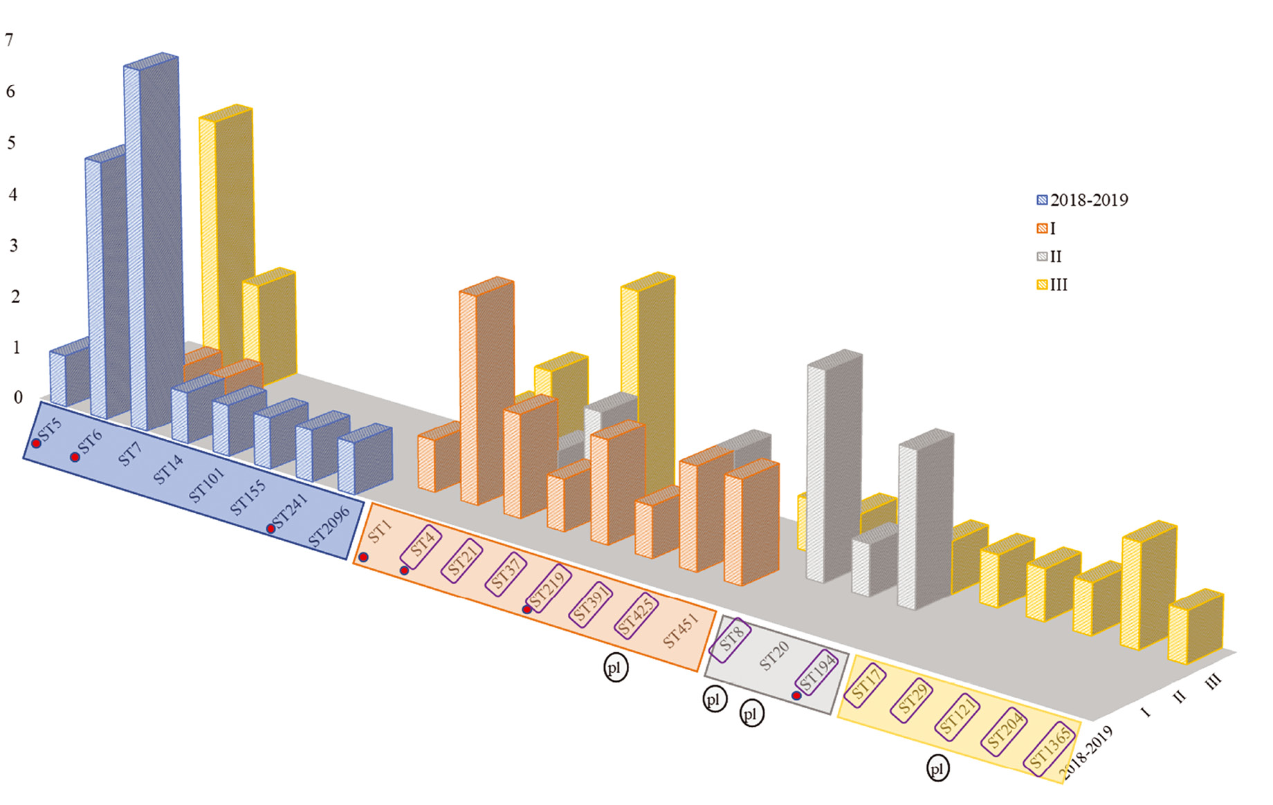 Fig. 3. Diversity of genotypes of L. monocytogenes clinical isolates before and during the COVID-19 pandemic. I–III — periods of the COVID-19 pandemic; isolates of phylogenetic lineage I are marked with red dots; new genotypes for L. monocytogenes clinical isolates are framed in purple. The presence of a plasmid in the genome is marked by pl shown in an oval.