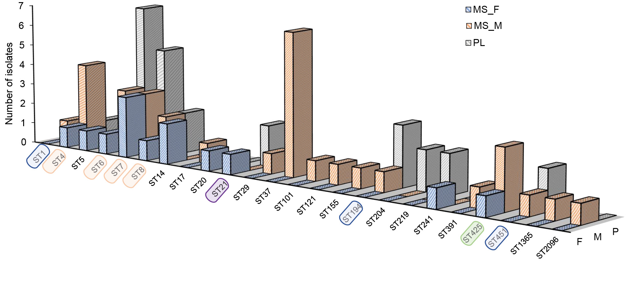 Generally, the number of genotypes matching those in the group of food isolates was higher in the MS_M group: there were 6 matching genotypes (ST7, ST8, ST37, ST121, ST155, ST451), while PL and MS_F groups had only 2–3 genotypes matching genotypes of food isolates.