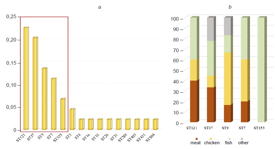 Fig. 5. L. monocytogenes isolates from food product. а — the frequency of occurrence of different L. monocytogenes genotypes in products; b — distribution of the most represented L. monocytogenes genotypes by product categories. The red frame shows the most represented L. monocytogenes genotypes.