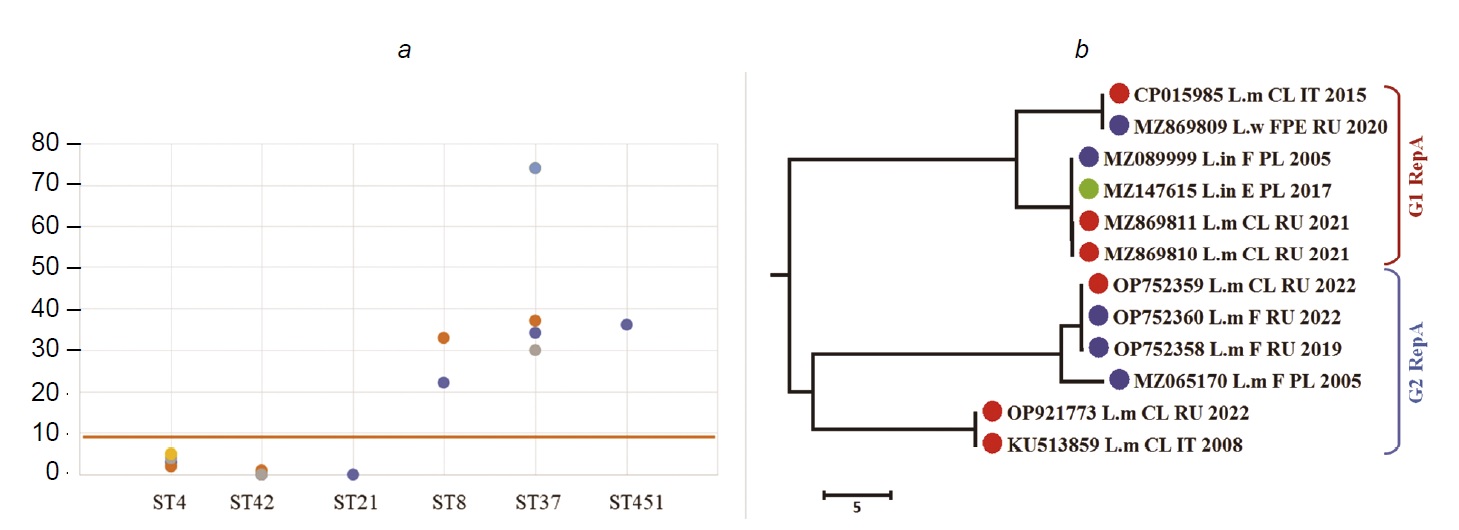 Fig. 6. Genomic characteristics of L. monocytogenes isolates. a — the number of loci differentiating core genomes of the same genotype; b — plasmidome of the isolate subset. The orange line indicates the permissible number of differences (7–10), based on which isolates can be assigned to the same epidemic outbreak. The Listeria species indicated on the phylogenetic tree: L.m — L. monocytogenes, L.w — L. welshimeri. Countries of origin of isolates: IT — Italy; PL — Poland; RU — Russia. Sources of isolates: F — food; E — environment; FPE — food production environment; CL — clinical isolates. Colored circles: red — clinical isolates; blue — food isolates; green — isolates from the environment.