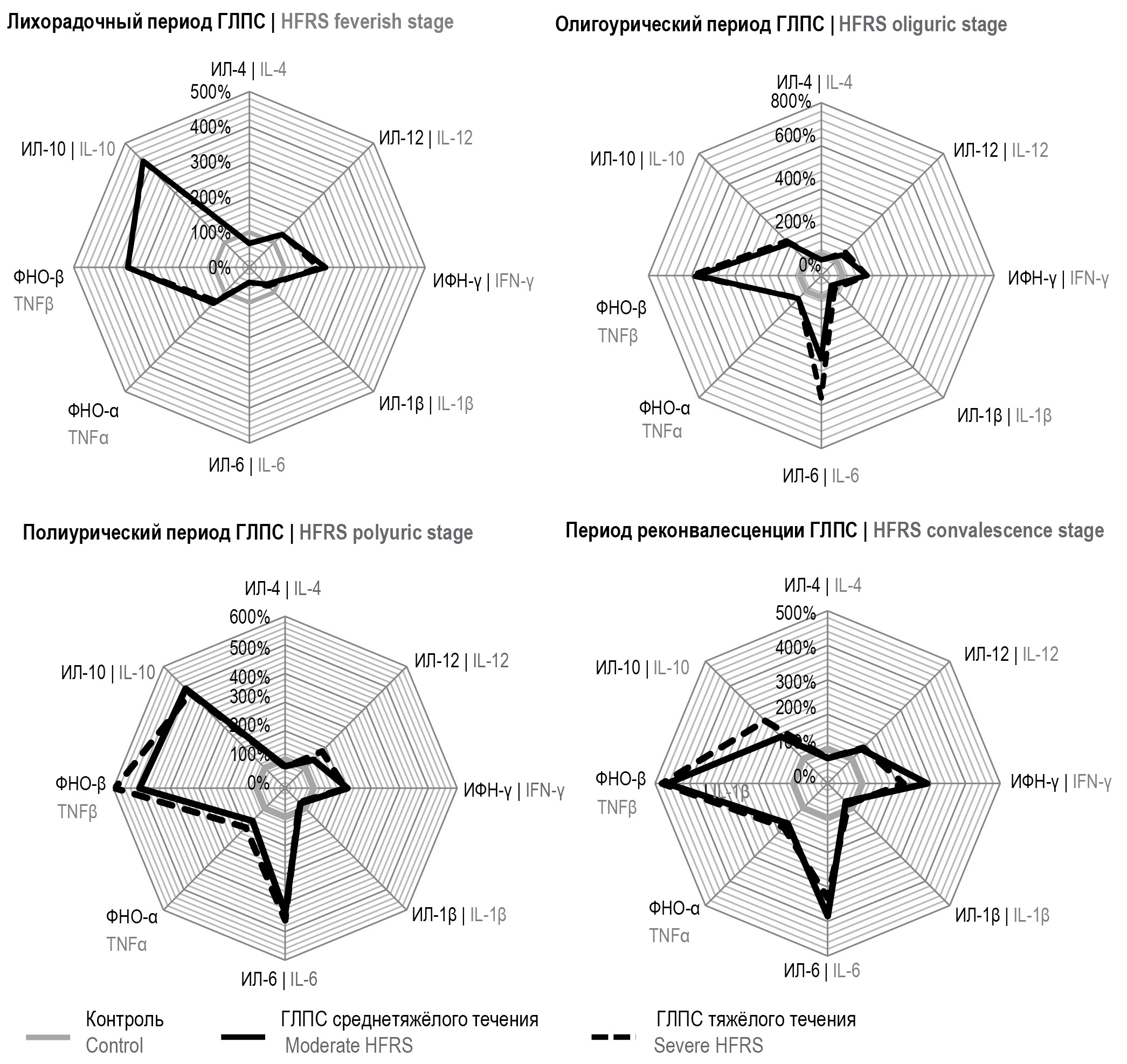 В лихорадочный период наблюдался рост содержания в крови цитокинов, сопряжённых с клеточными (цитотоксическими) иммунными реакциями: ИЛ-12, ИФН-γ, ФНО-α, ФНО-β. Кроме того, наиболее значительно возрастал уровень ИЛ-10 — цитокина с иммуносупрессорными и противовоспалительными свойствами. Уровни остальных цитокинов, в том числе провоспалительного действия (ИЛ-1β, ИЛ-6), достоверно снижались. При этом совсем не выявлялись различия между цитокиновыми профилями больных со среднетяжёлым и тяжёлым течением ГЛПС.