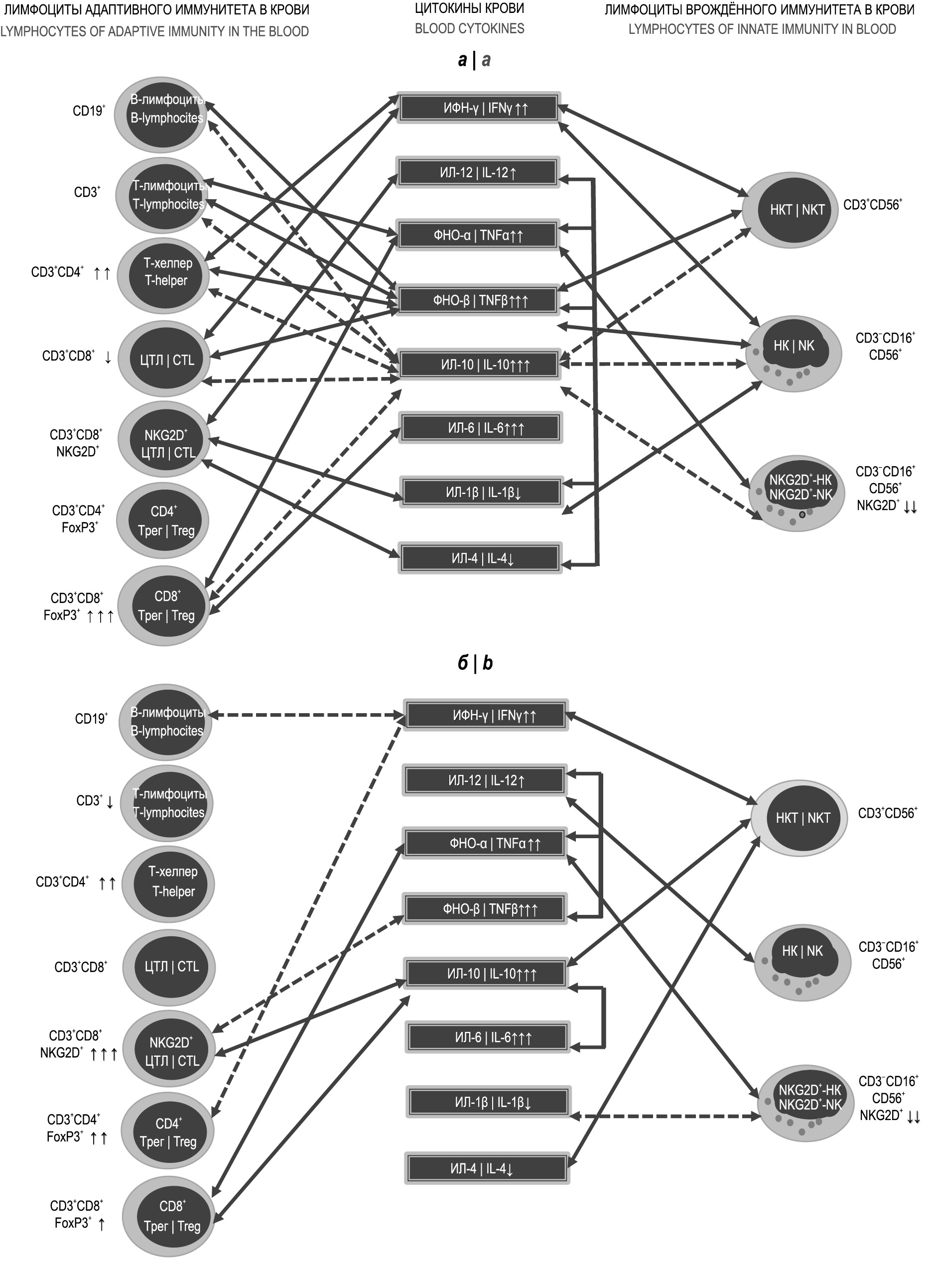 Рис. 2. Достоверные корреляционные связи между уровнями цитокинов и содержанием лимфоцитов различных фенотипов в крови при ГЛПС среднетяжёлого (а) и тяжёлого (б) течения. Сплошные стрелки — положительные корреляции; пунктирные — отрицательные корреляции. / Fig. 2. Significant correlations between the levels of cytokines and the content of lymphocytes of various phenotypes in the blood in patients with moderate (a) and severe (b) HFRS. Solid arrows — positive correlations; dotted lines — negative correlations.